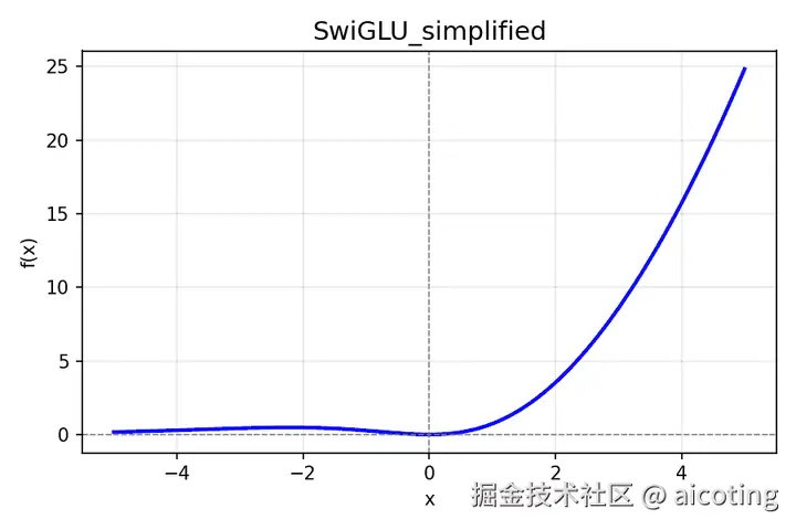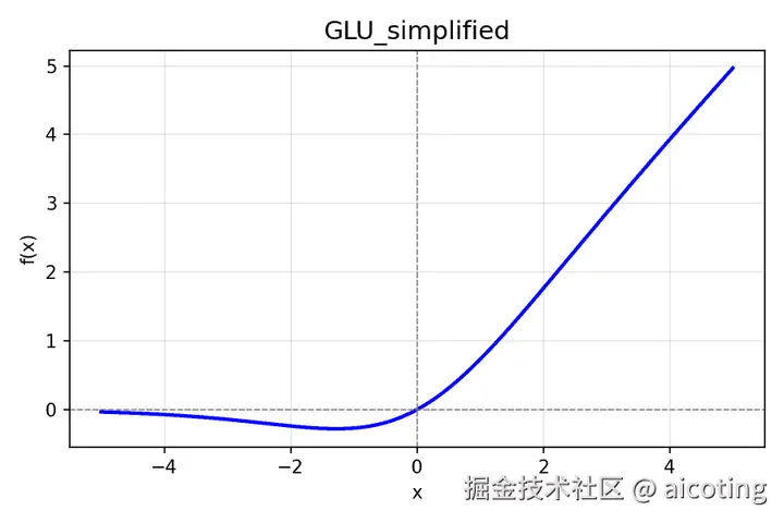 GLU/SwiGLU 在实际中是门控形式(two linear branches),是向量上的逐元素操作;为了在一维上可视化,我用简化的标量形式来画图 —— 把两条分支都用相同的输入值(即把 a=x, b=x),因此 GLU(x)=x∗sigmoid(x) SwiGLU(x)=x∗SiLU(x) 。这能直观展示门控机制的形状差异。