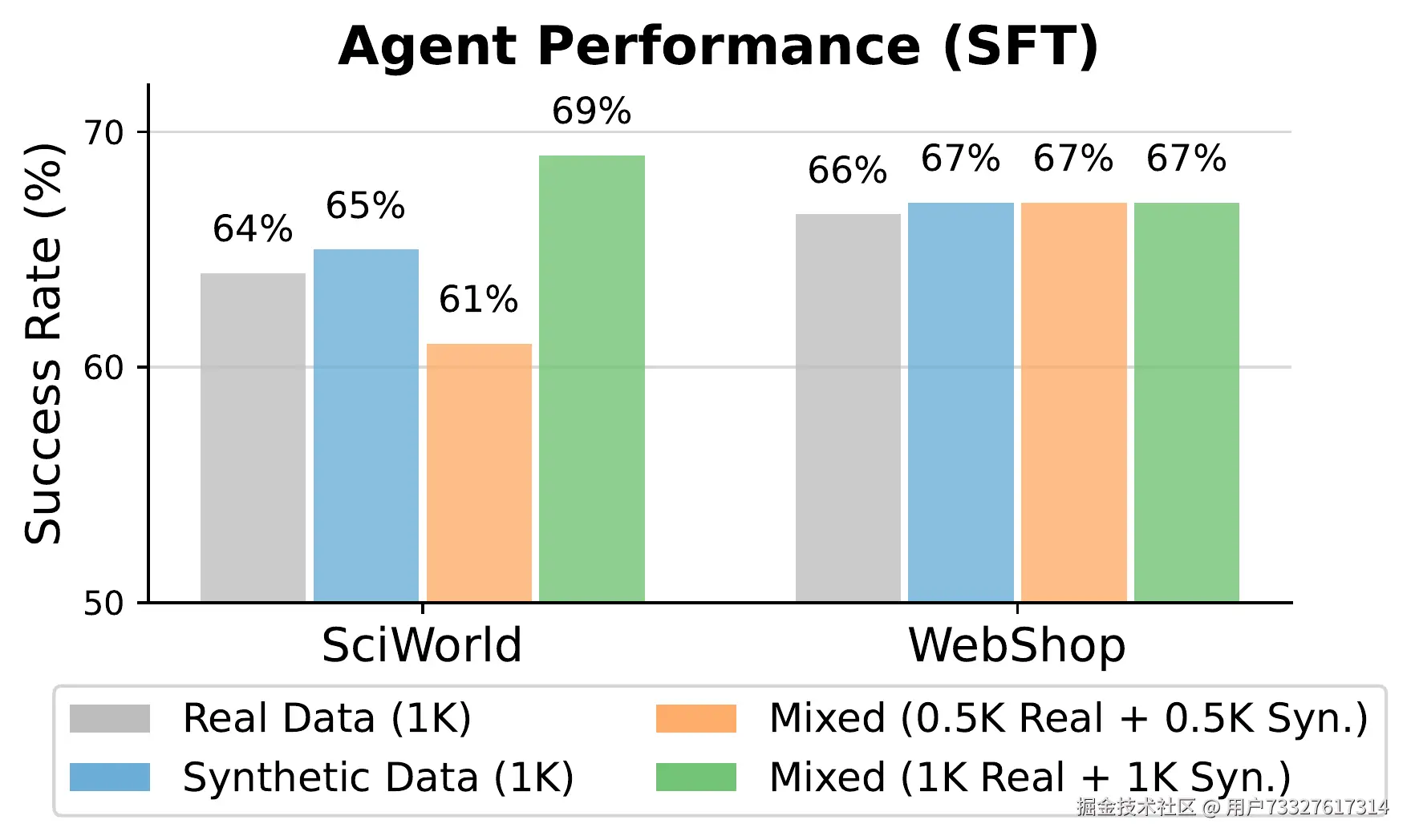 研究发现世界模型生成的轨迹与真实数据极具竞争力。在SciWorld中,合成数据的性能与真实数据相当,而混合使用两种数据源的效果优于单独使用任何一种。