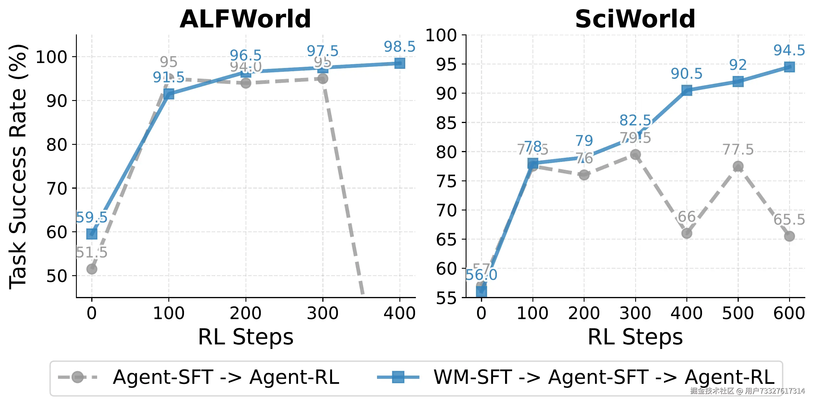 研究者的WM-SFT → Agent-SFT → RL流程在ALFWorld和SciWorld上均带来了持续增益,稳定了RL训练并产生了更高的最终成功率。