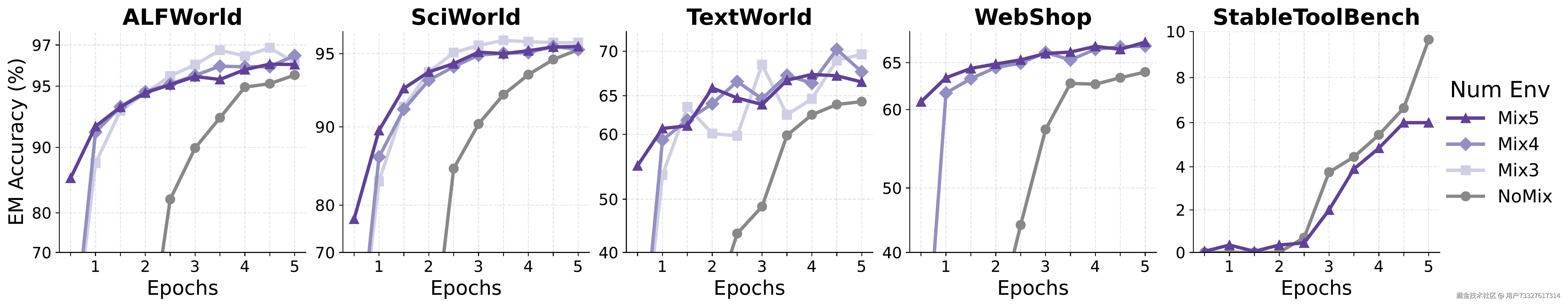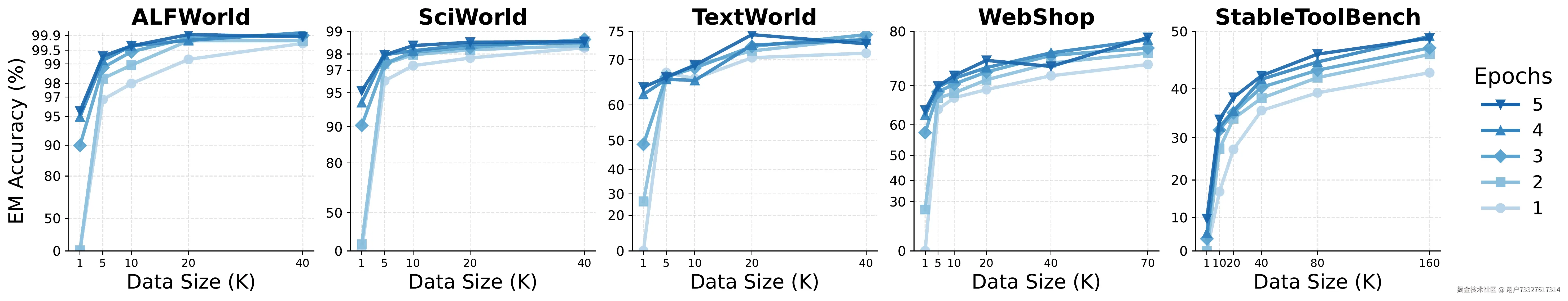 数据扩展方面:结构化环境改进迅速,在约2万条轨迹时饱和,与其低熵动态一致。开放式环境的扩展更为平缓——WebShop在多达7万条轨迹时仍受益,而StableToolBench在16万条样本下仍未显示饱和迹象。