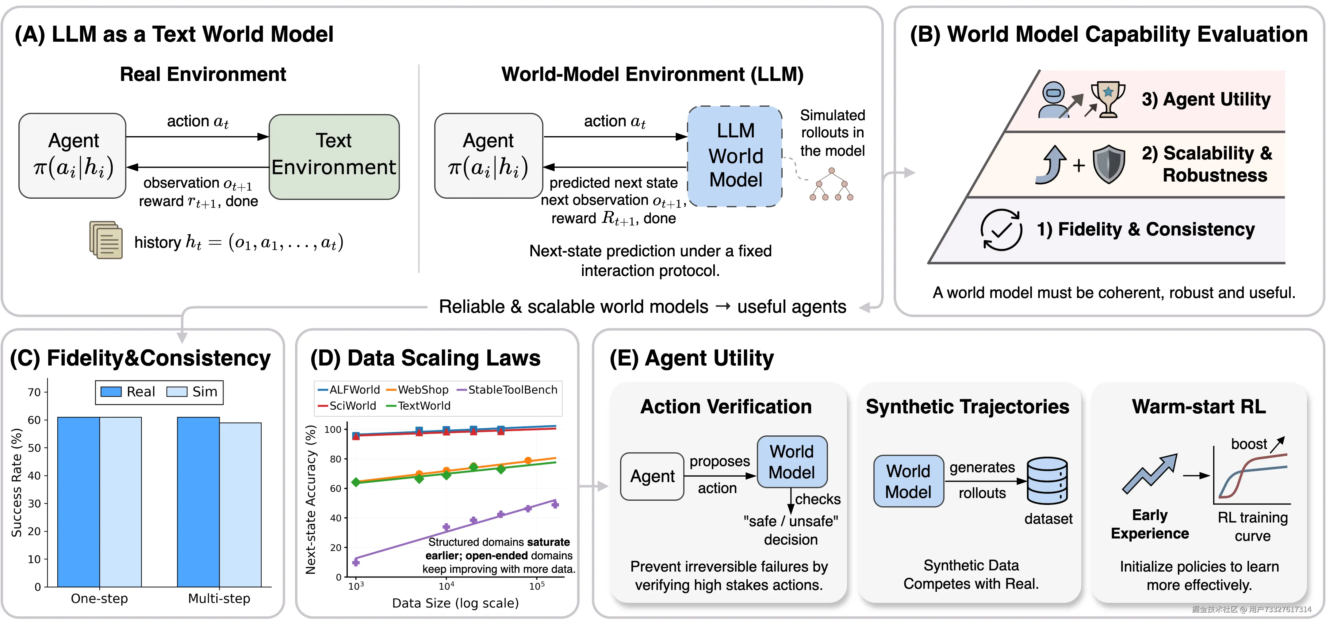 这种抽象方式保留了智能体与环境交互的核心挑战——状态追踪、动作执行、奖励预测——同时将目标从「预测下一个Token」重构为「预测下一个状态」。
