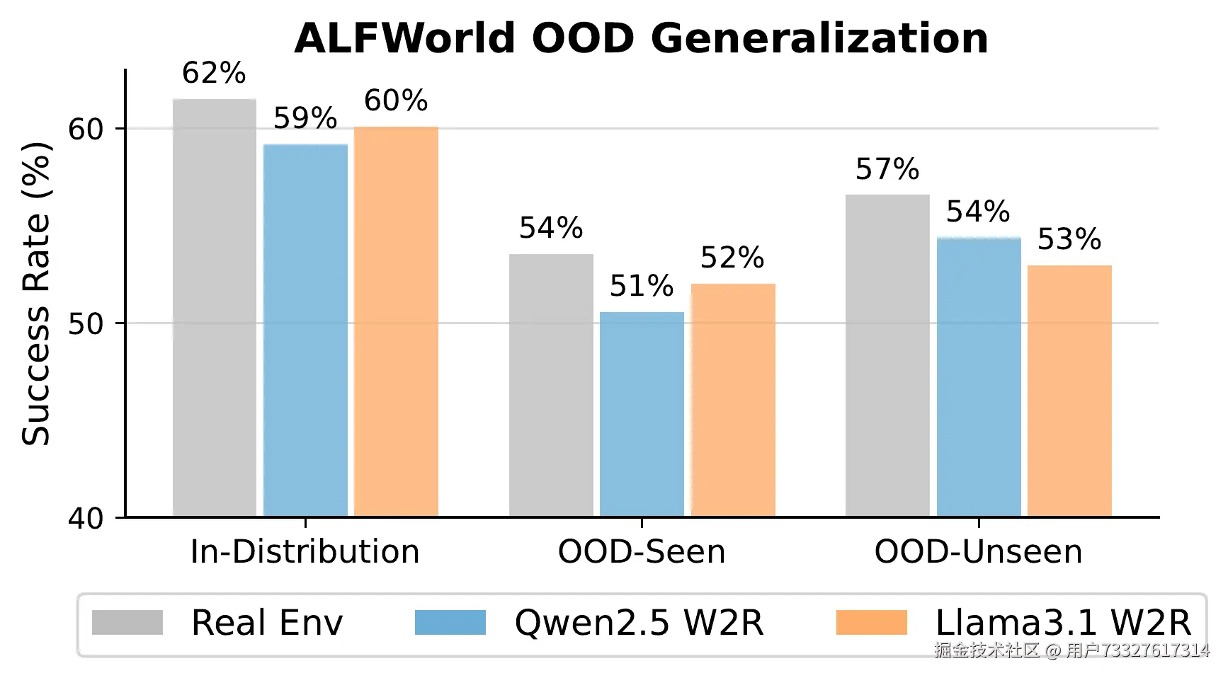 研究团队在ALFWorld中通过分布外(OOD)评估测试了这一点,改变了房间布局并引入了全新的房间类型。