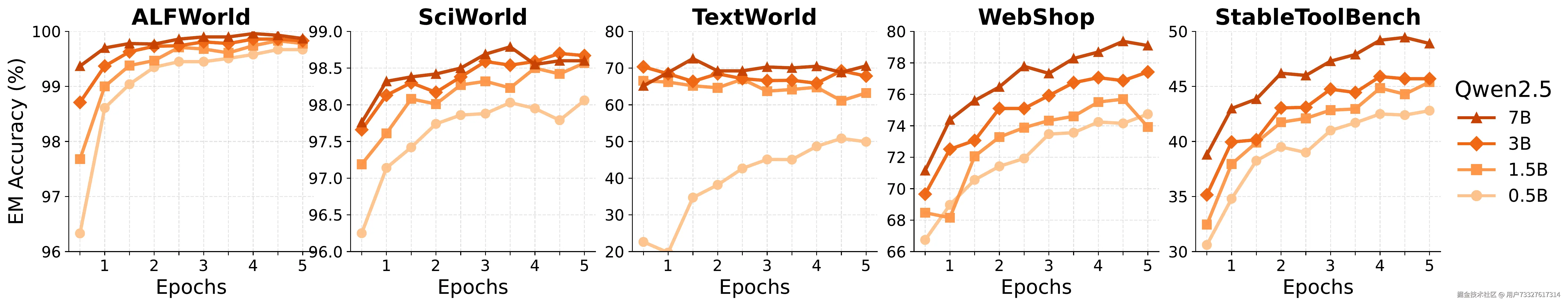 模型扩展方面:在结构化环境中,1.5B的模型已经可以捕捉核心动态。在开放式环境中,更大的模型提供稳定的准确率增益,表明成功需要海量数据和足够的容量。