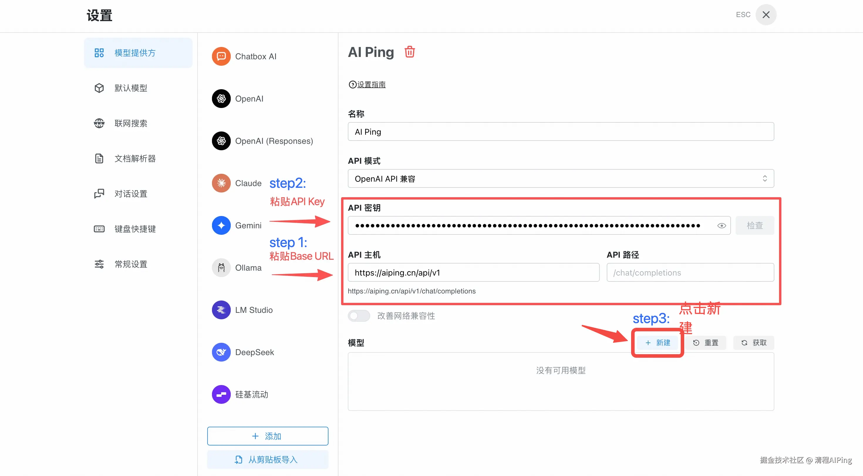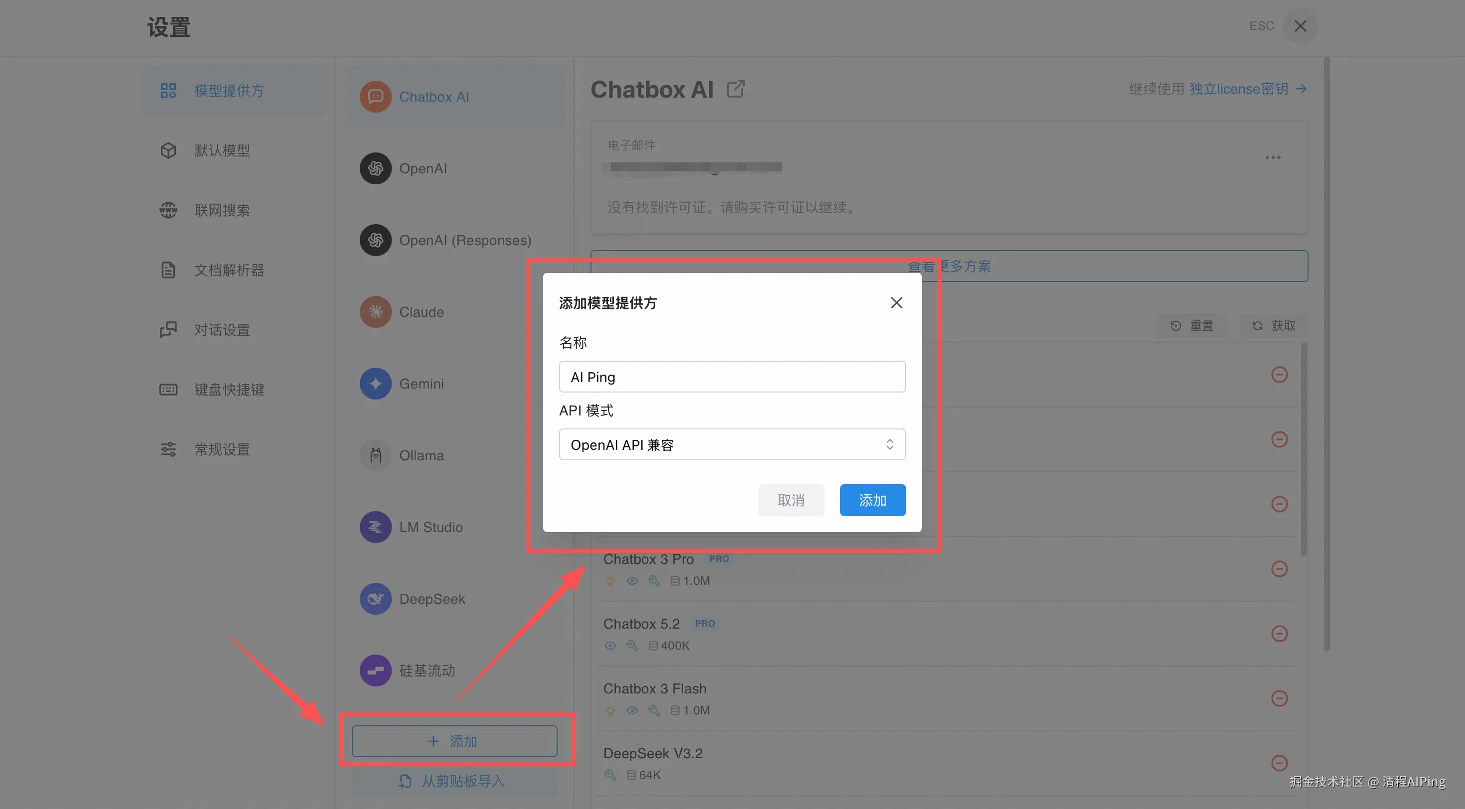 2)在“设置”的“模型提供方”界面下方,点击“添加”。输入名称 AI Ping,API 模式默认选择“OpenAI API兼容“。