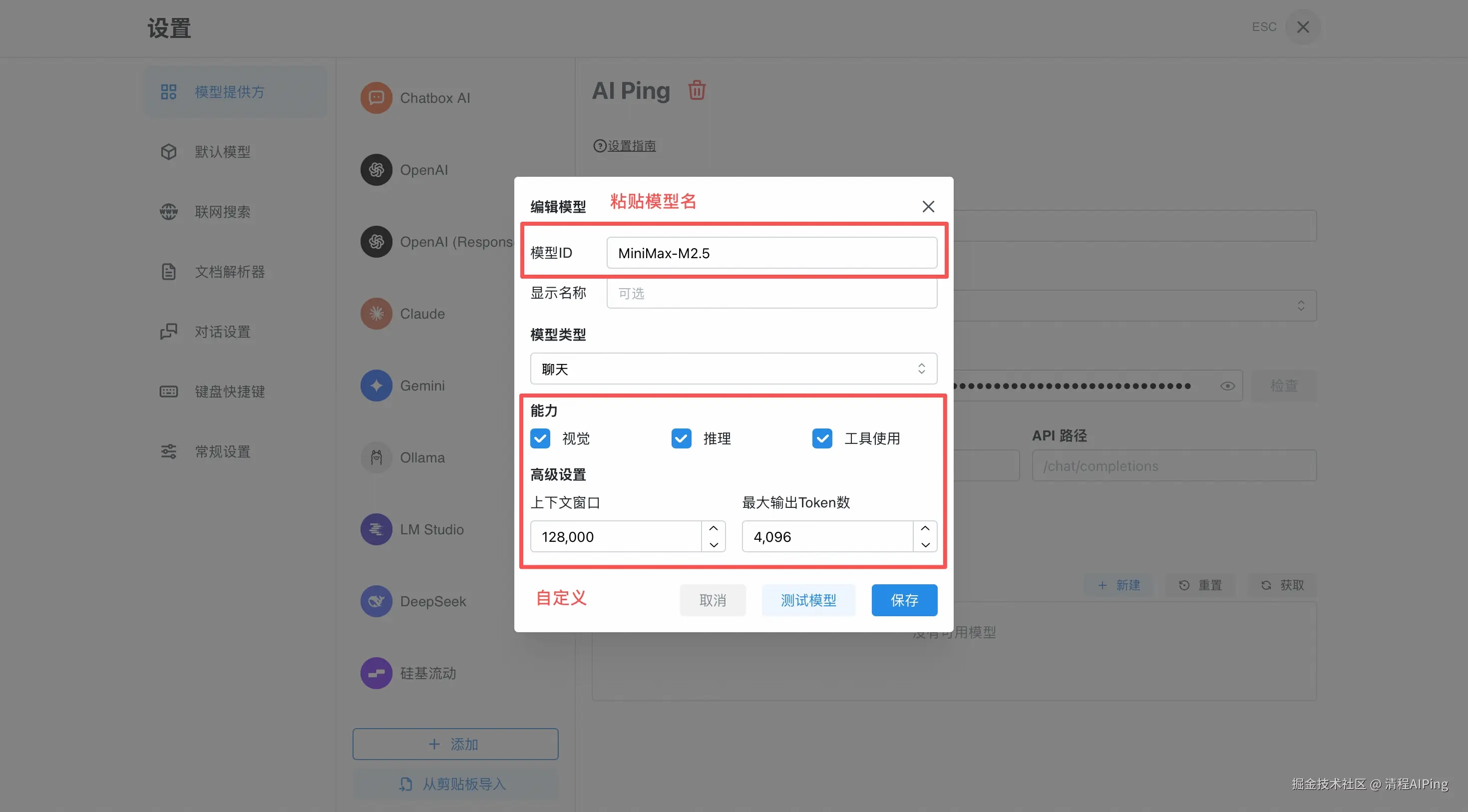 2)自定义模型的能力、上下文窗口和最大输出Token数,然后“保存”以上设置。
