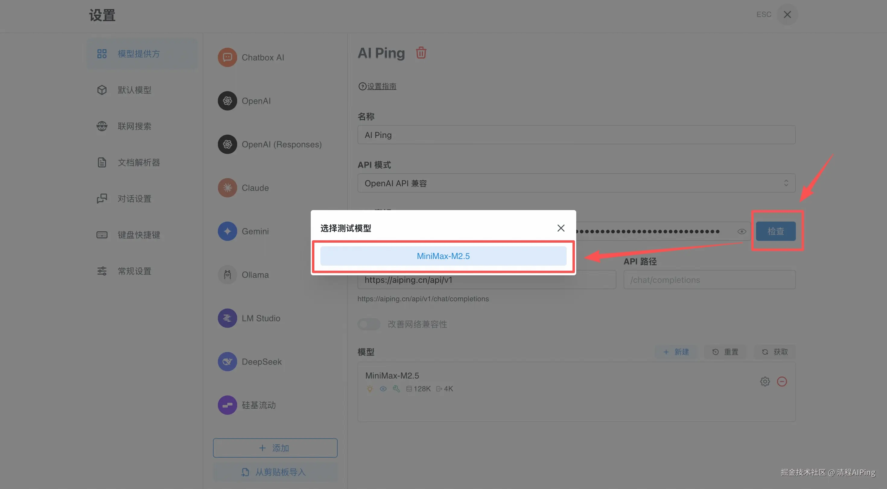 3)点击API Key旁的“检查”,进行模型测试。
