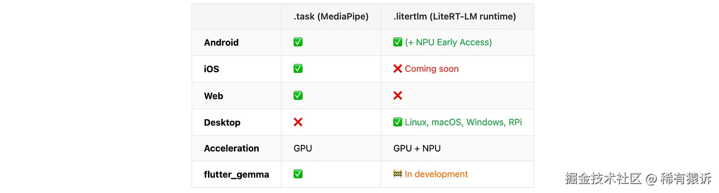 litertlm — 这是 Google 推出的一种新格式,是 .task 的升级版,具有更好的压缩效果和额外的元数据。MediaPipe 也可以在 iOS、Android 和 Web 上运行 .litertlm,但不具备 NPU 等额外功能。 .litertlm 的主要优势在于其独立的运行时 LiteRT-LM:它支持 NPU(神经处理单元),可实现更强大的加速,并支持桌面平台——Linux、macOS、Windows,甚至 Raspberry Pi。但 LiteRT-LM 运行时目前仍处于早期预览阶段:iOS 和 Web 平台暂不支持(即将推出)。
