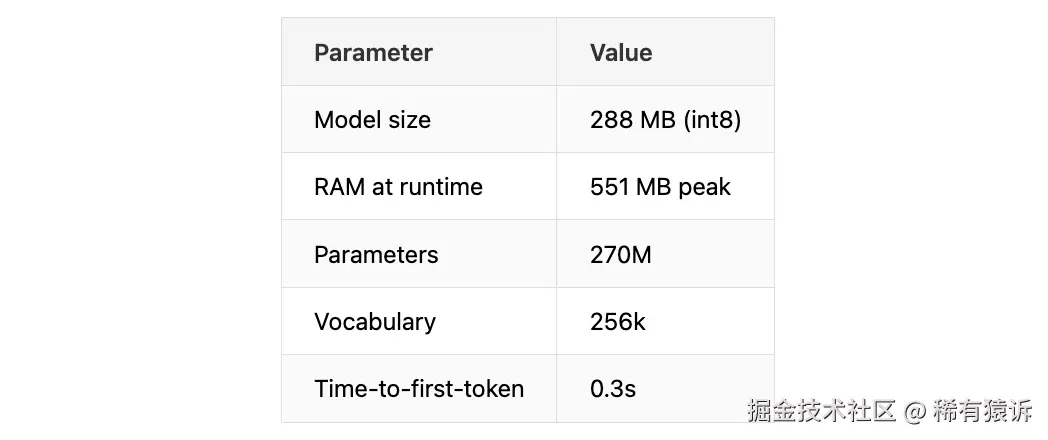 2.7 亿个参数 — 比 Gemma 3n E2B 小 10 倍,但足以满足函数调用需求