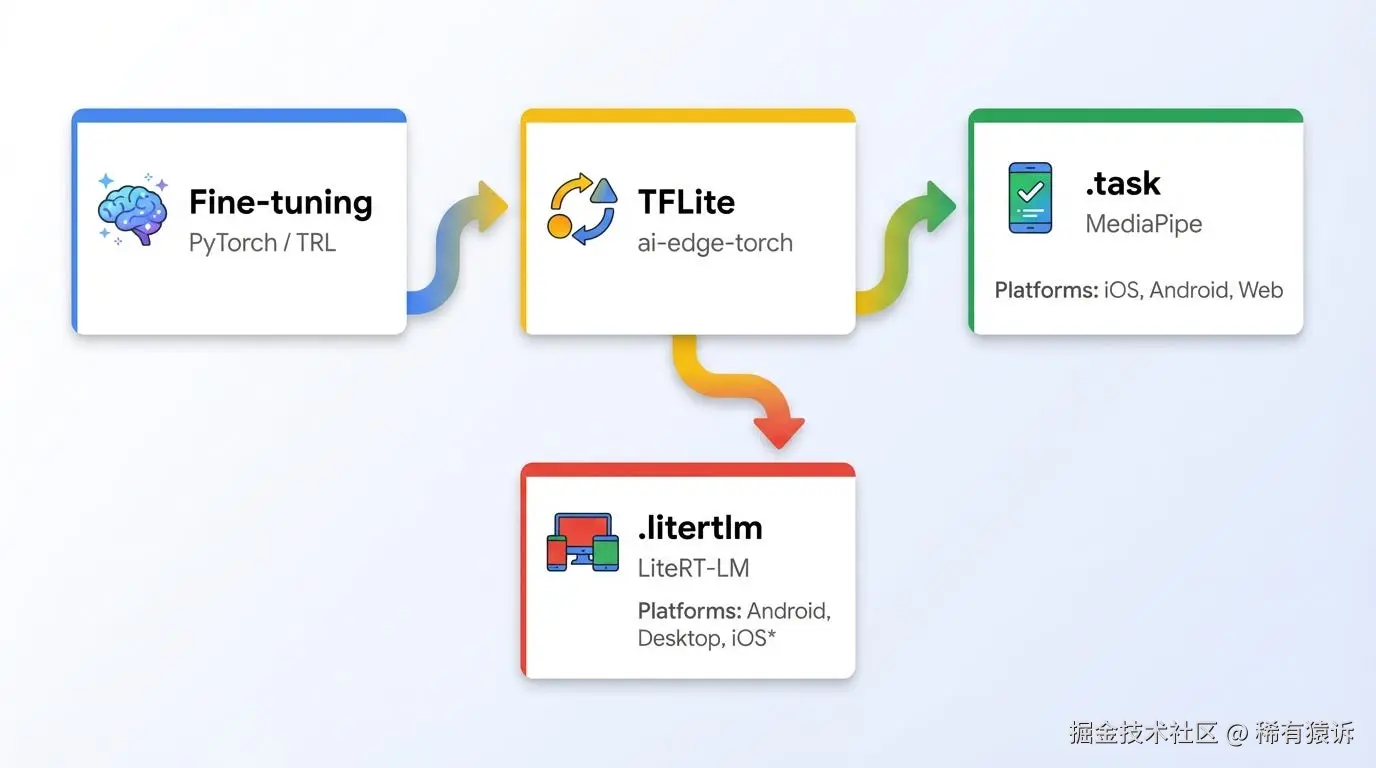 让我们详细了解一下模型准备流程——从微调到最终生成可在设备端运行的格式。理解这一点至关重要,因为 Google 最初只发布了 PyTorch 格式的 FunctionGemma 模型,而移动端部署需要进行格式转换。