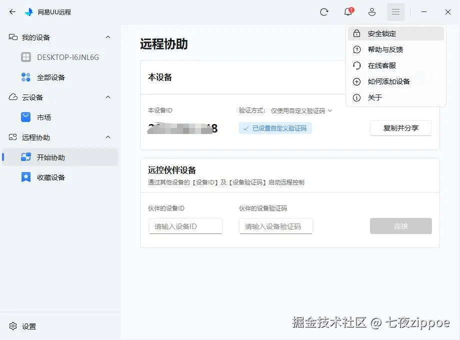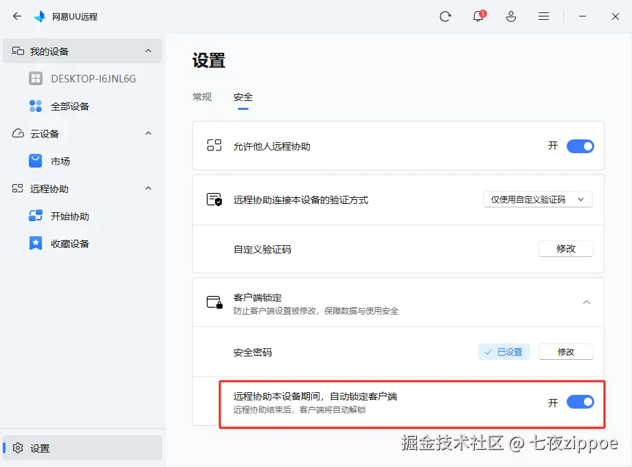 自动锁定:在设置中开启“远程协助本设备期间,自动锁定客户端”。一旦被控,客户端自动进入锁定状态,无需任何手动操作,如下图