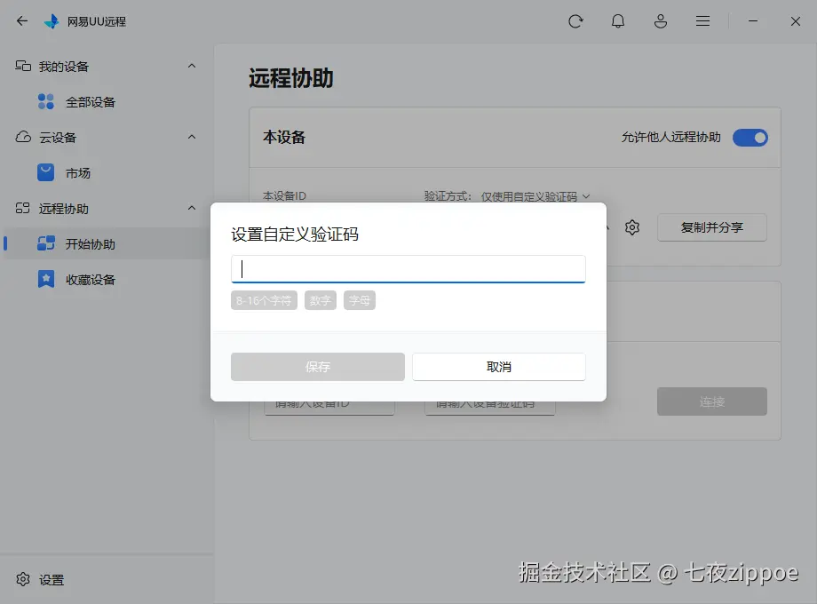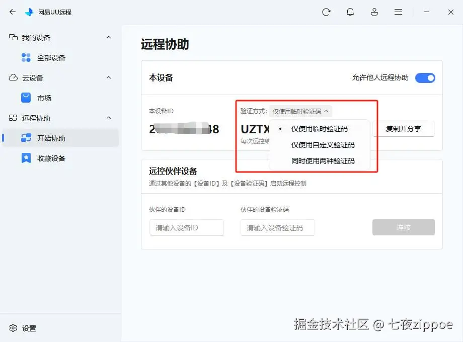 - 在【远程协助】→【开始协助】→验证方式中选择"仅使用自定义验证码"