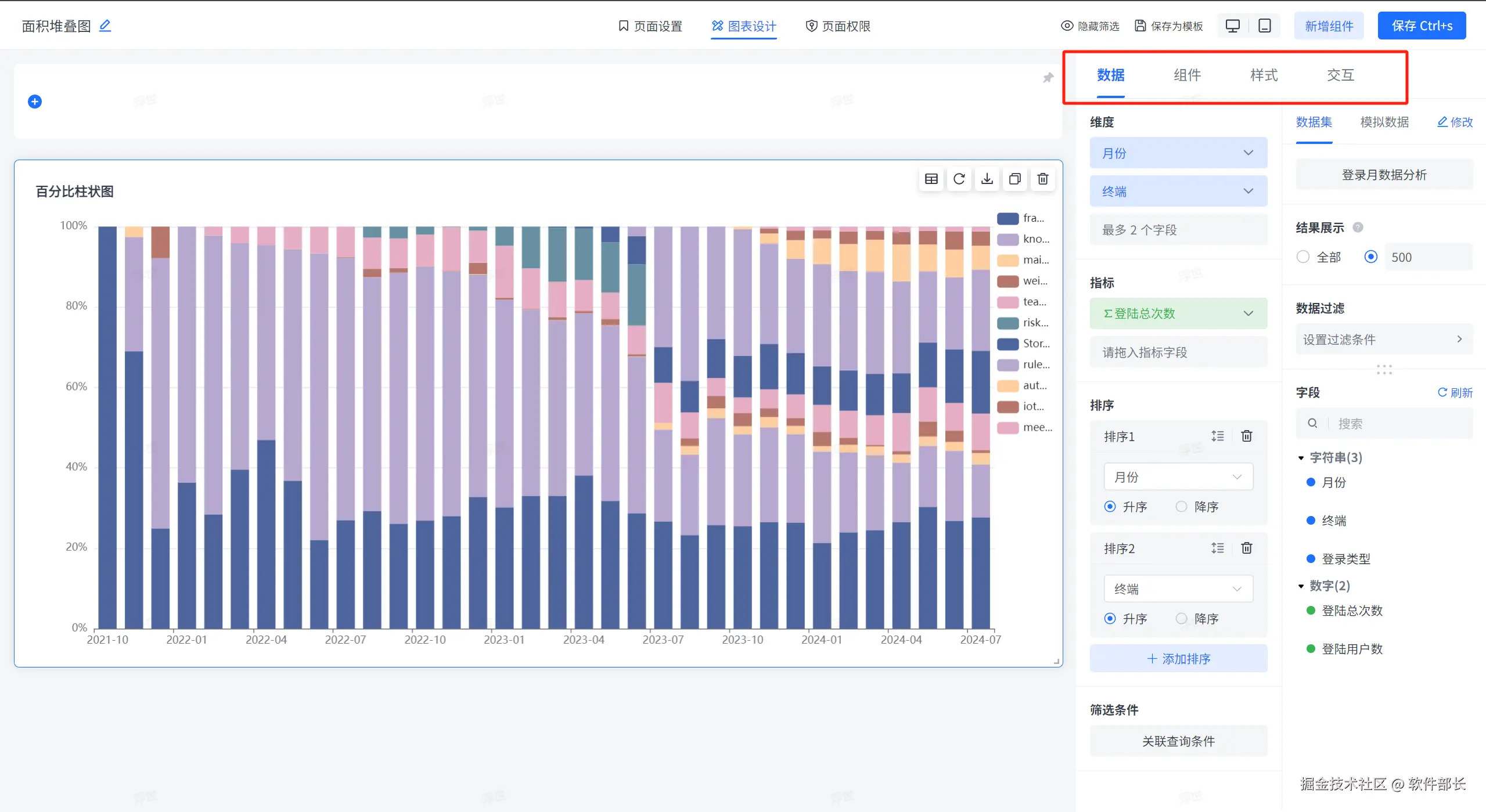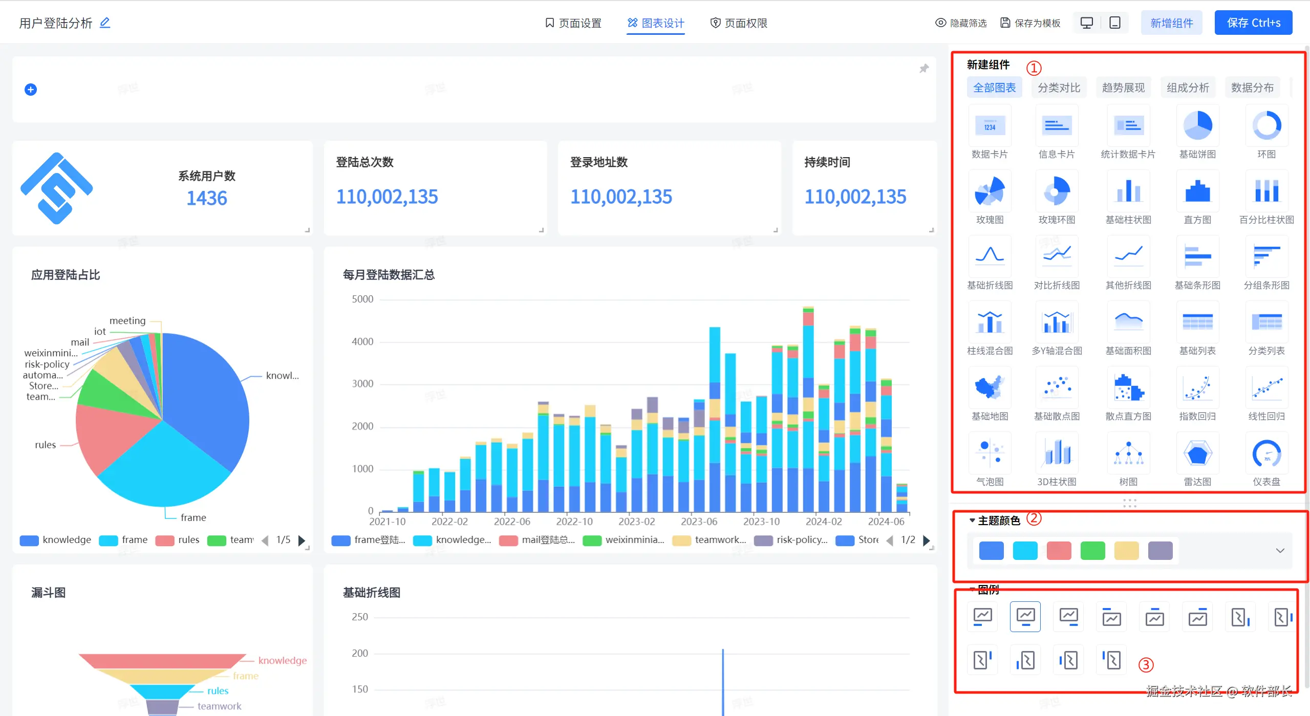 ①:展示系统内部提供的内置的图表组件,点击后可以在左侧页面新增组件