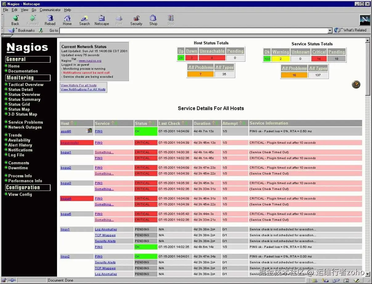 Nagios®是一款主机与服务器监控系统,能在客户、终端客户或管理员发现问题前,第一时间向用户发出预警。它专门为Linux操作系统设计,但在大多数类 UNIX 系统中也能正常工作。监控守护进程会通过外部 "插件" 对您指定的主机和服务进行间歇性检查,这些插件会向 Nagios 返回状态信息。当遇到问题时,守护进程可以通过多种不同方式(电子邮件、即时消息、短信等)向管理员联系人发送通知。当前状态信息、历史日志和报告均可通过网页浏览器访问。