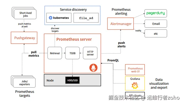Prometheus 采用多维数据模型与灵活的 PromQL 查询语言,能够实时分析时序指标;支持自动服务发现、静态配置两种目标管理方式,并可通过 Alertmanager 实现多渠道告警通知(邮件、Slack 等)。