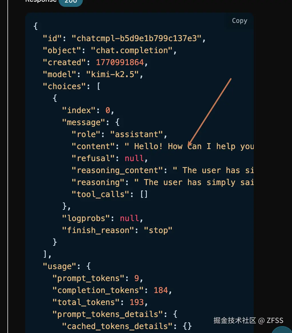 id,生成此次对话任务的 ID,用于唯一标识此次对话任务。model,选择的 Kimi 官网模型。choicesKimi 针对提问词给于的回答信息。usage:针对本次问答对 token 的统计信息。