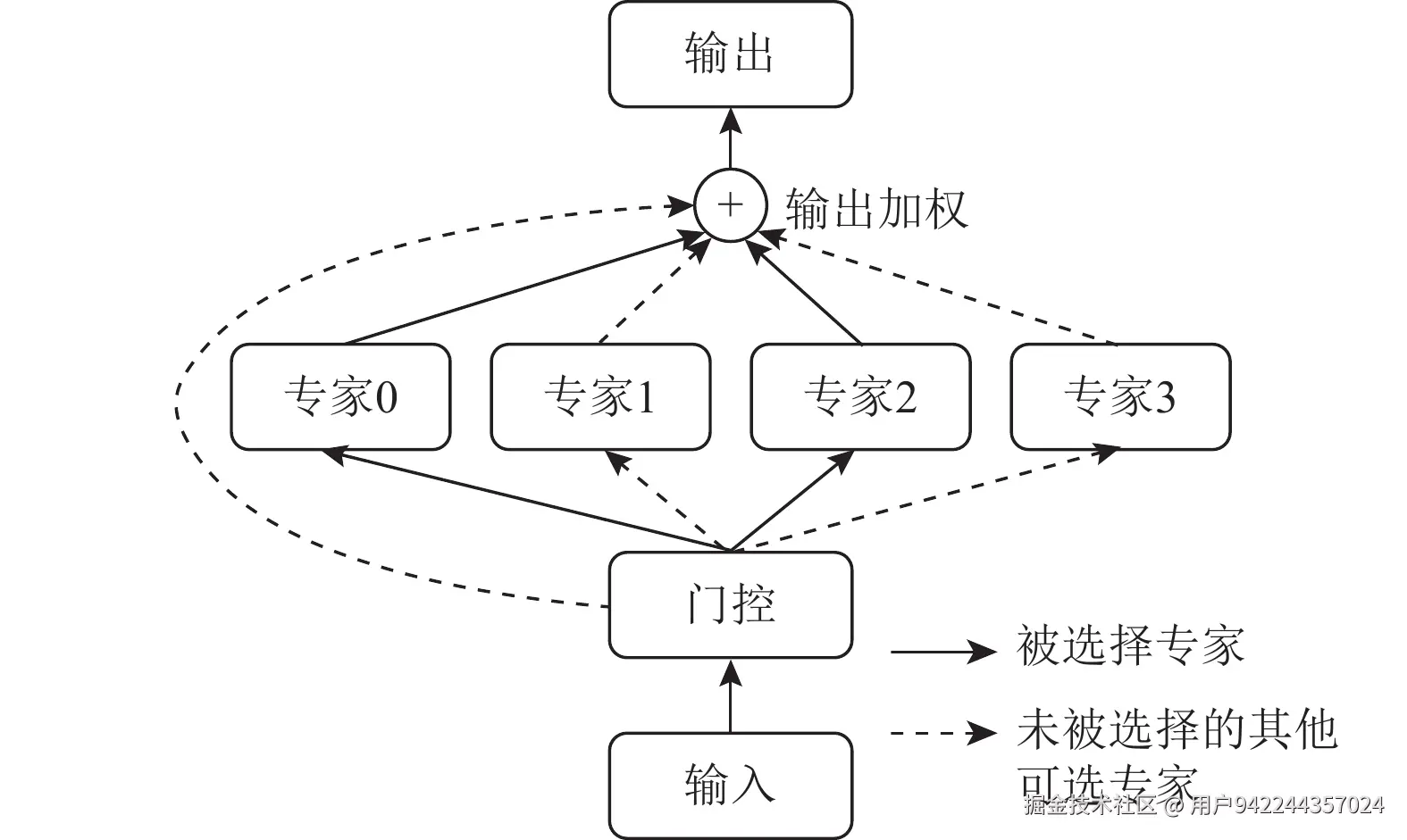 混合专家模型(MoE)架构示意图,展示专家路由与并行计算机制