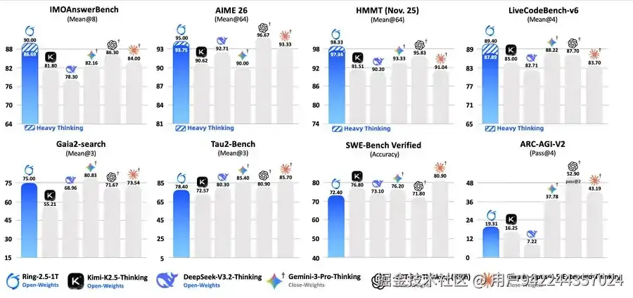 - Ring-1T / Ring-2.5(万亿参数):专注复杂推理与深度思考,数学竞赛金牌水平,长程执行能力突出
