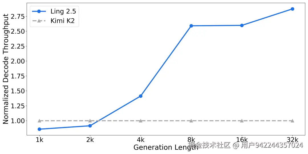 Ling-2.5模型在不同生成长度下的性能表现,展示超长上下文处理能力
