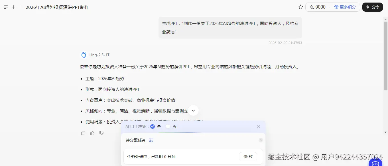 任务指令:"制作一份关于2026年AI趋势的演讲PPT,面向投资人,风格专业简洁"