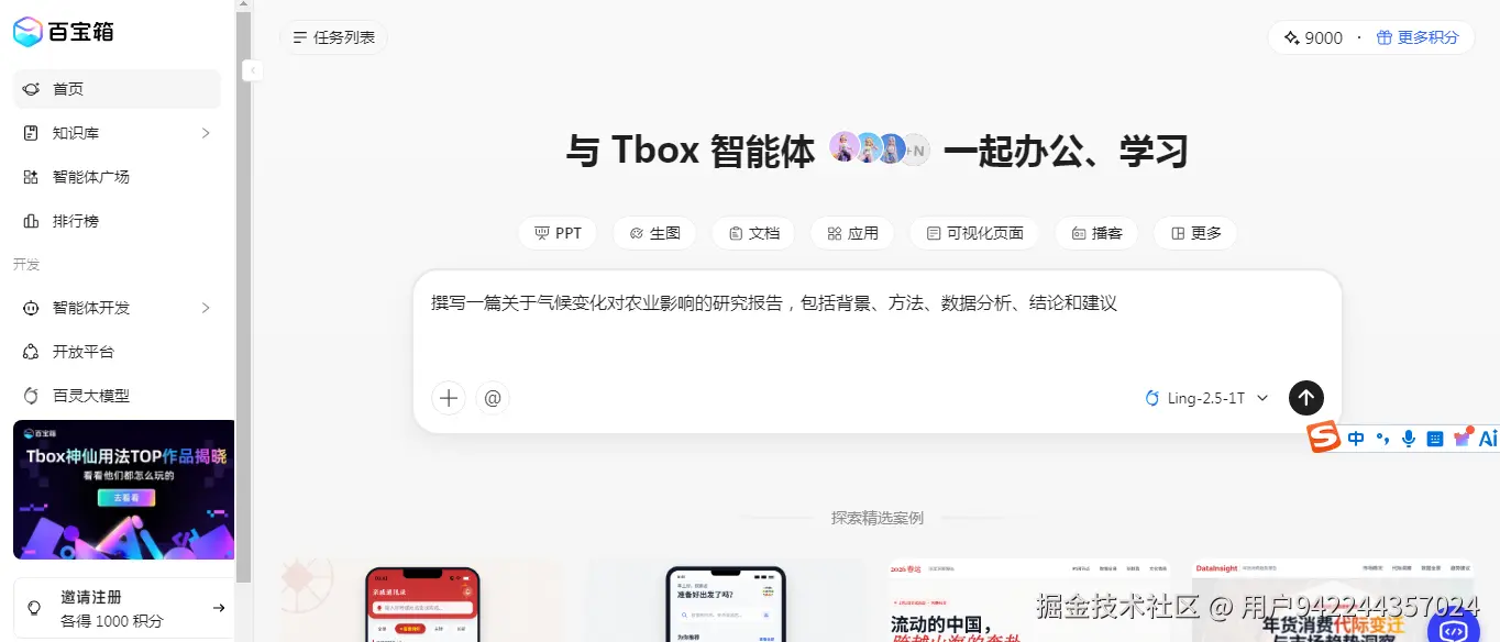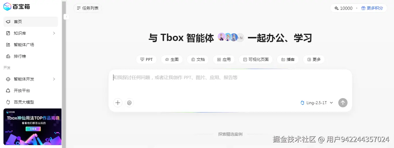 除了在Ling Studio中使用,最新的Ling大模型也已深度集成到蚂蚁百宝箱Tbox超级智能体中。但现在的Tbox已经不再是之前那个单纯的智能体搭建平台——它已进化为与扣子空间同级的超级智能体,主打"一句话完成任务"的办公与学习场景。