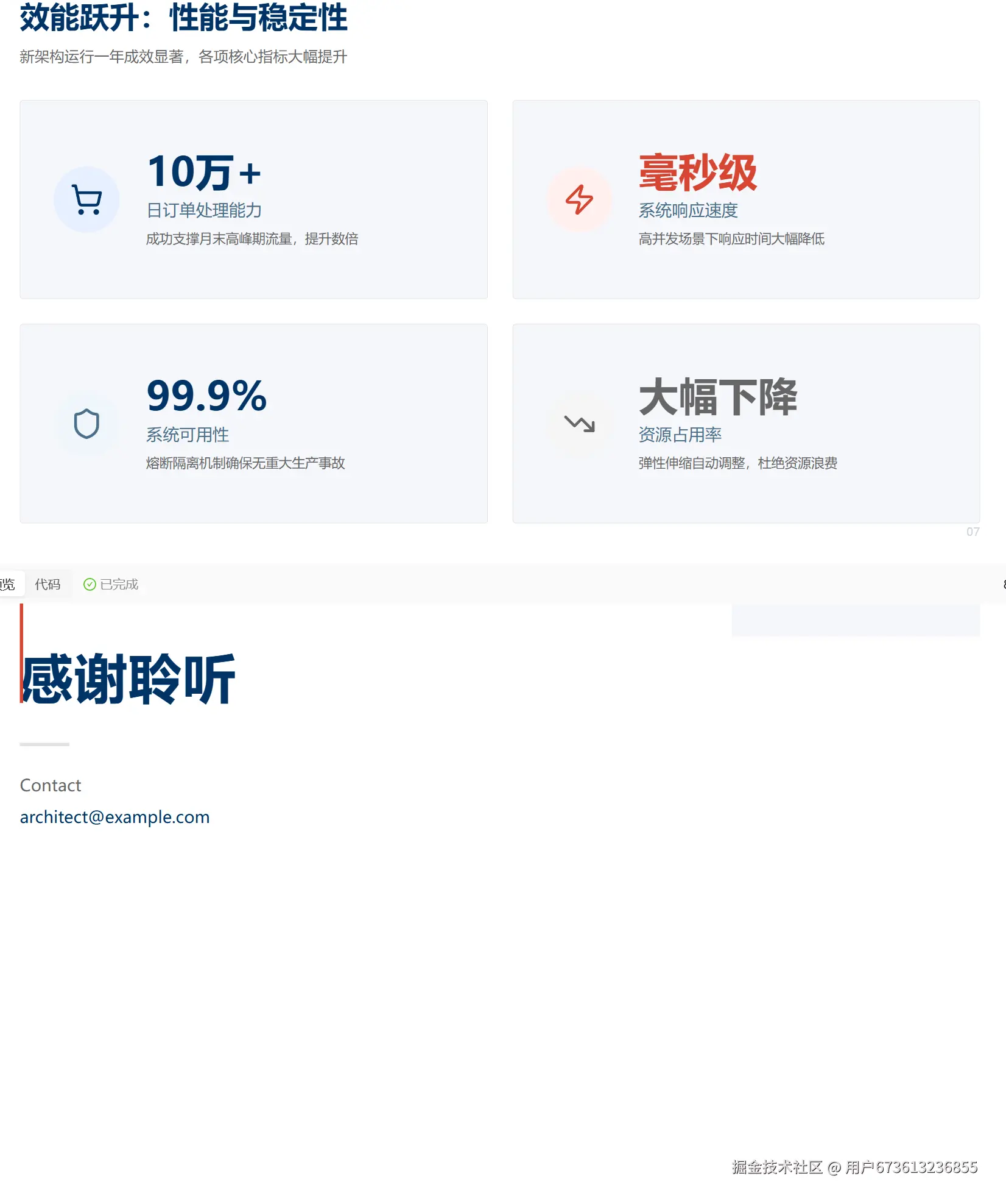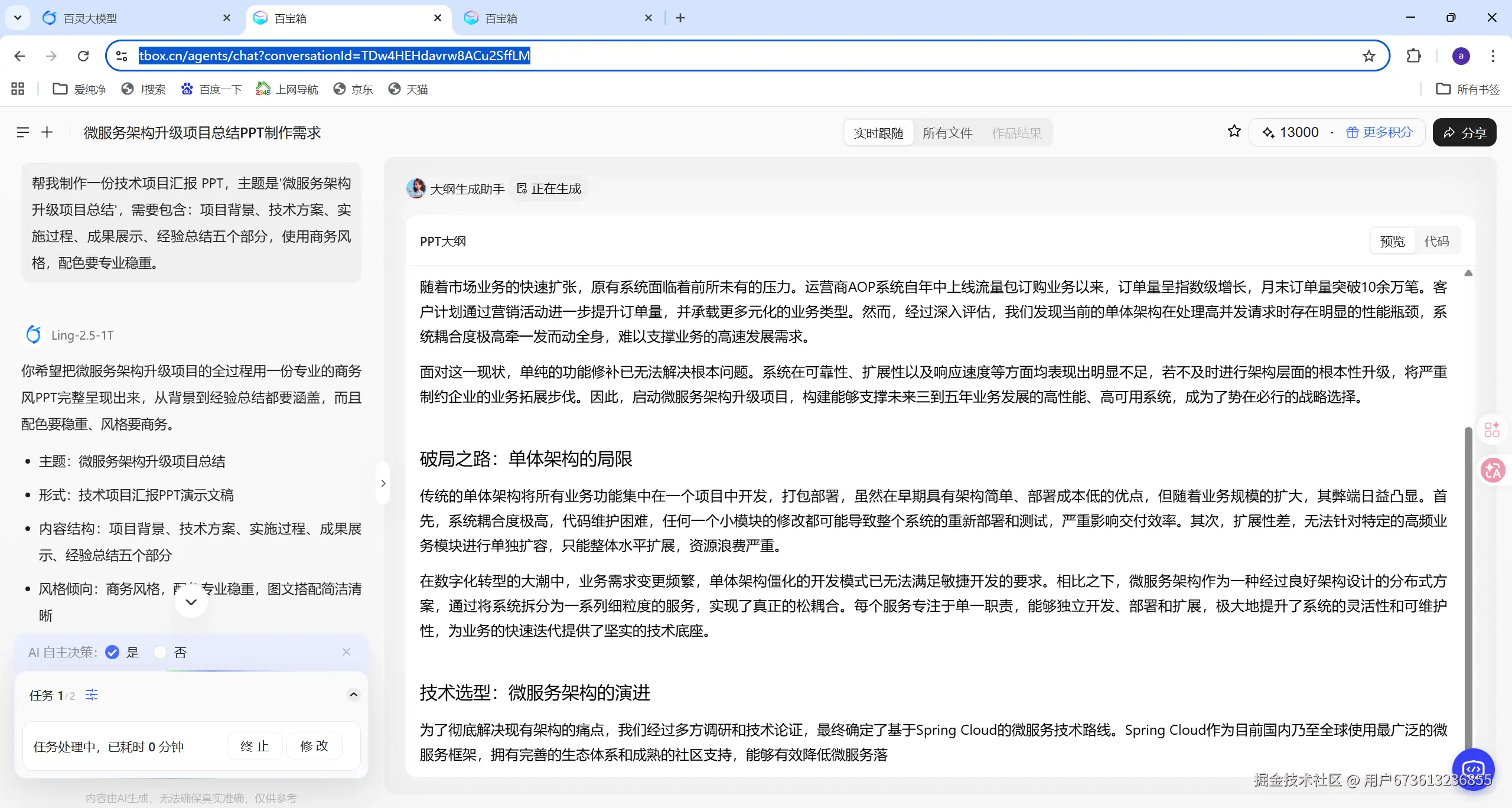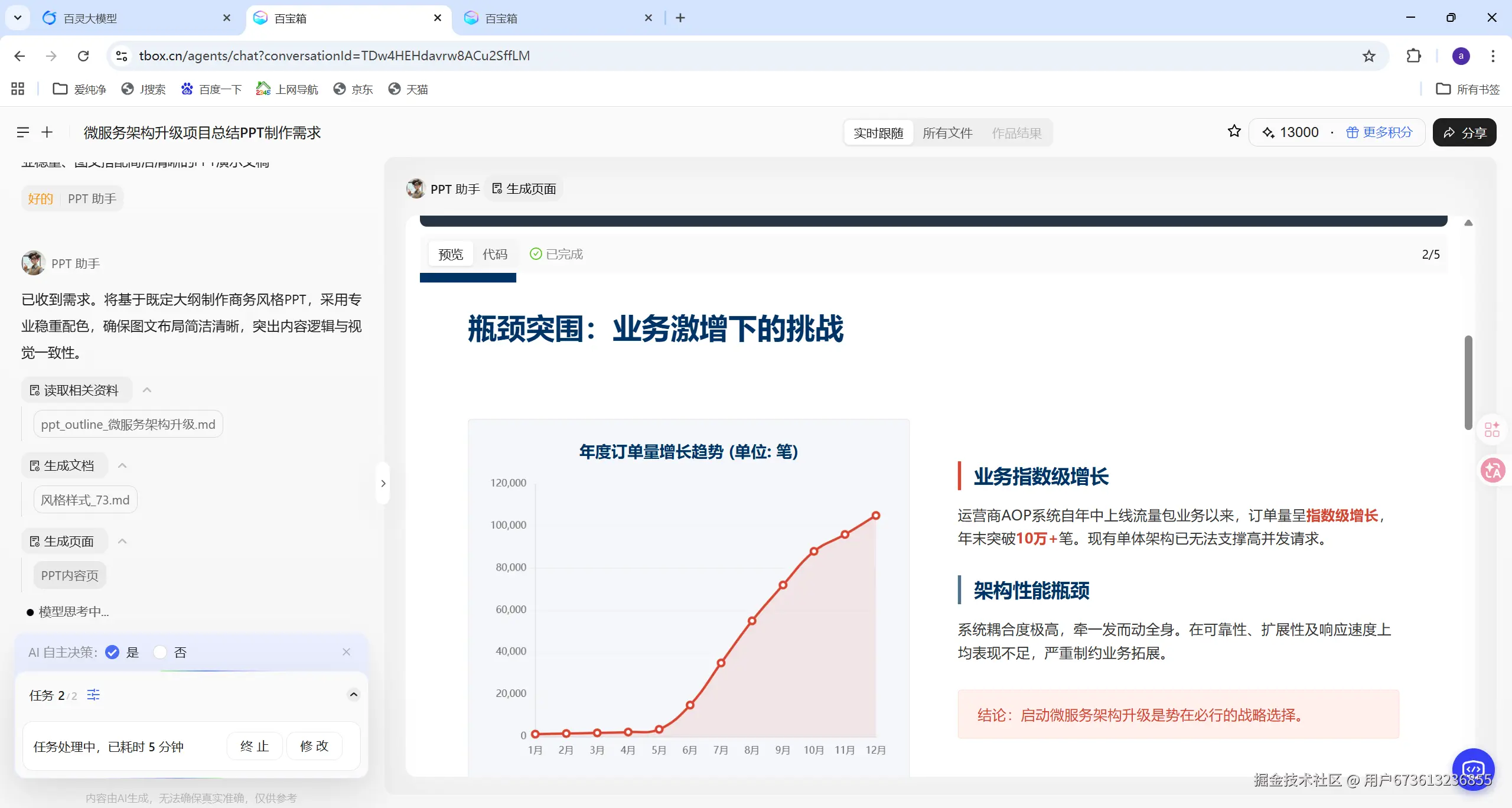 我输入了这样的需求:"帮我制作一份技术项目汇报 PPT,主题是'微服务架构升级项目总结',需要包含:项目背景、技术方案、实施过程、成果展示、经验总结五个部分,使用商务风格,配色要专业稳重。"