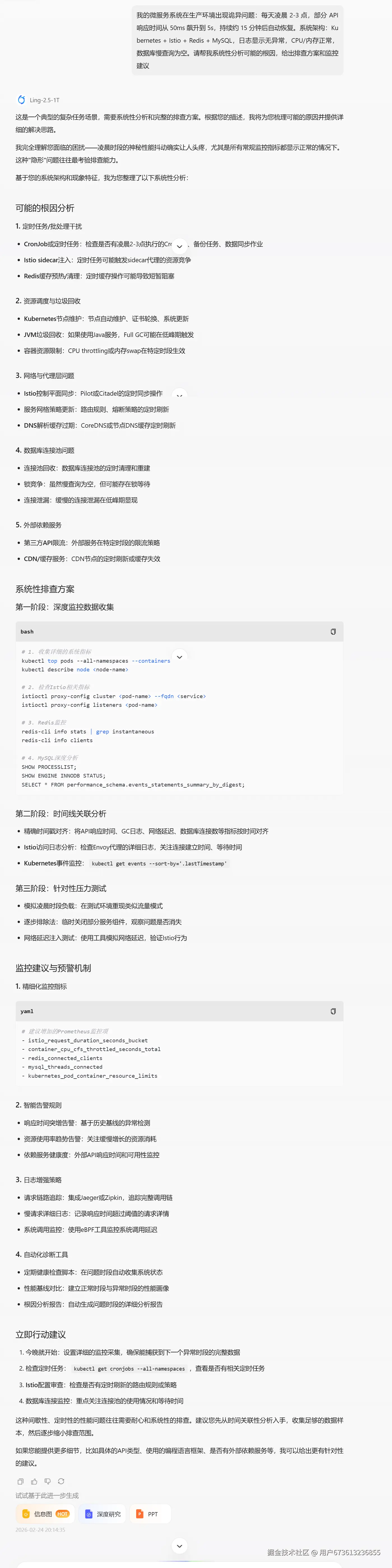 模型不仅给出了可能的原因,还提供了具体的排查步骤和监控建议。这种长链条的任务执行能力,正是 Ling-2.5-1T 在长期任务执行方面的优势体现。