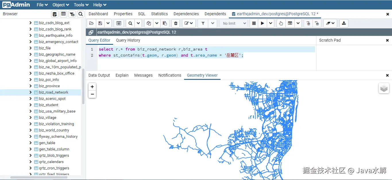 运行上面的程序就实现了OSM路网数据的导入,路网的范围是湖南省范围内的,为了验证数据是否完全导入,这里我们使用pgAdmin查询界面来验证,之所以要用这个工具,并不是navicat不能用,而是这个工具自带了一个地图 **可视化的界面,可以辅助查看数据的可视化效果。下面以查询长沙市岳麓区的路网信息为例,执行以下sql: