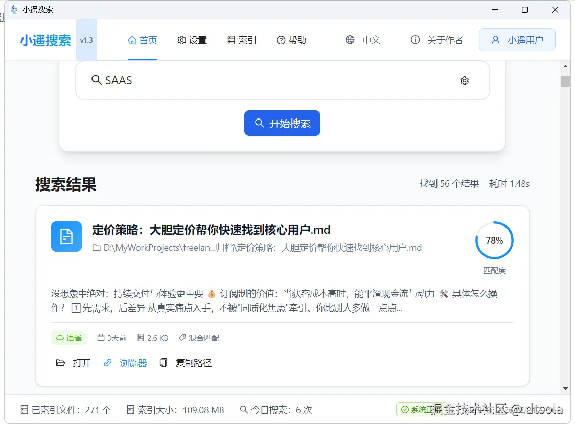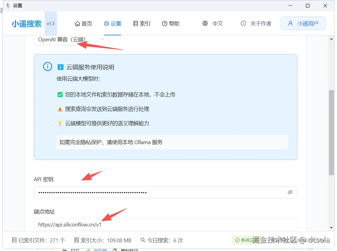小遥搜索 v1.3.0 新增 OpenAI 兼容云端大模型支持,用户可自由切换本地 Ollama 和云端服务(OpenAI/阿里云/DeepSeek/Moonshot 等)。