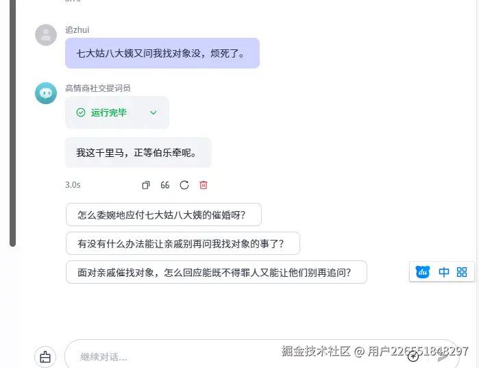 - 意图识别:智能体通过语义分析,提取出“对象”、“催婚”等核心意图。