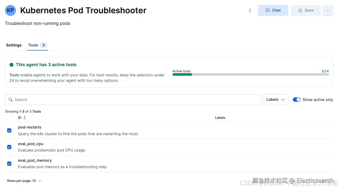 该图片展示了 Kubernetes Pod Troubleshooter agent ,并且三个 tools 已分配并处于激活状态: pod-restarts 、 eval-pod-cpu 和 eval-pod-memory 。
