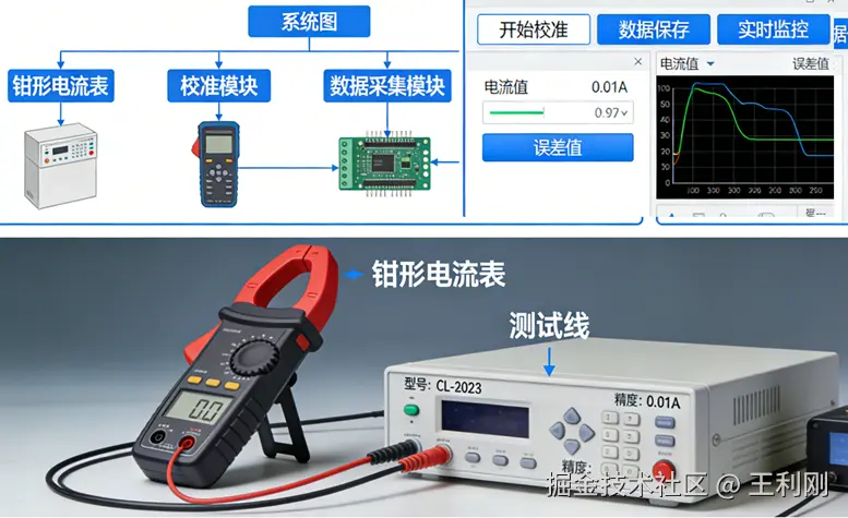 - 数据交互层:包含本地校准数据库与云端数据同步模块,数据库固化不同型号钳形电流表的校准规范、量程参数、校准点序列,支持校准数据的本地存储与云端溯源。