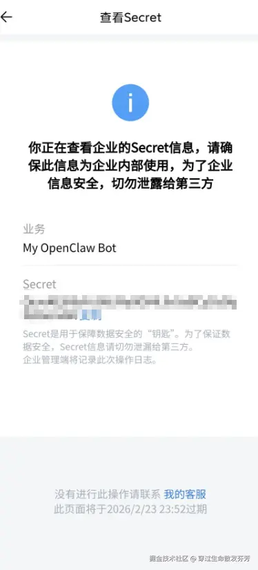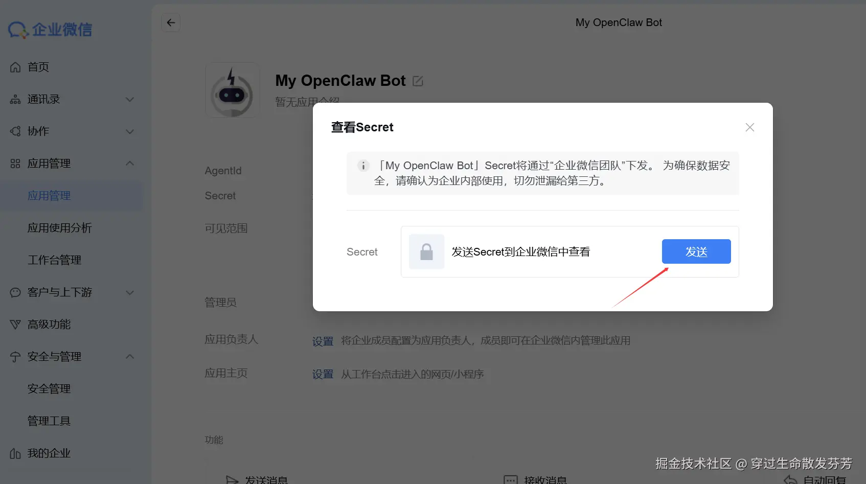- Corp Secret,在应用详情页内,找到Secret,并点击查看按钮,在弹窗中点击发送,在企业微信中查看。