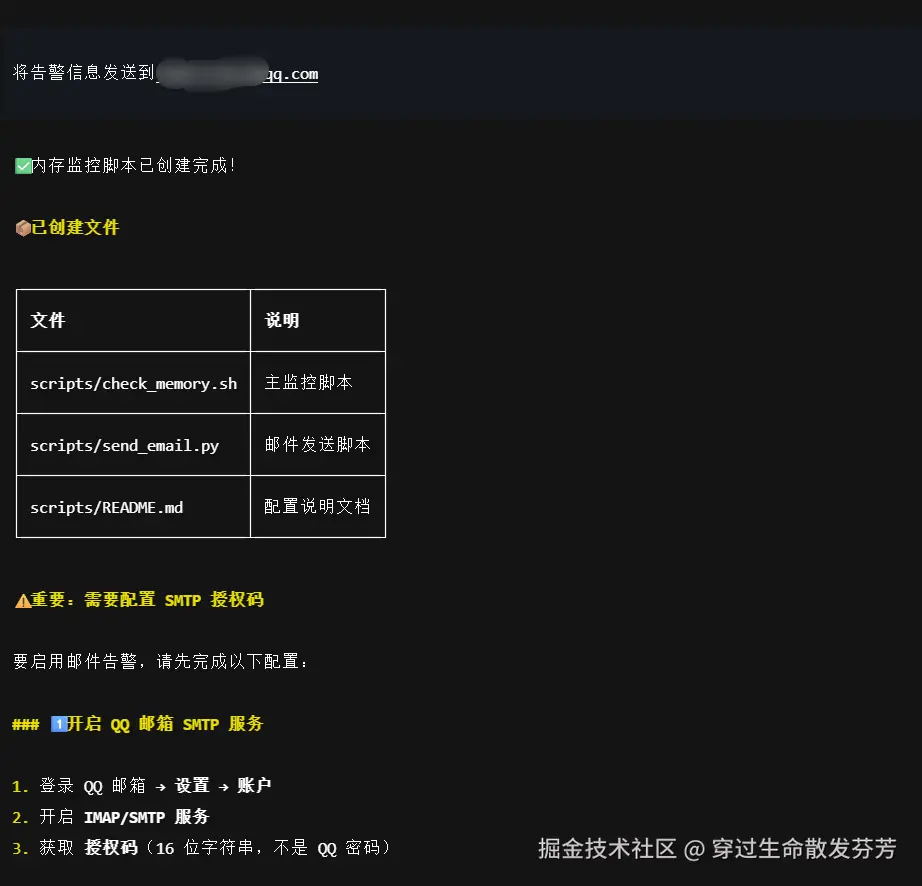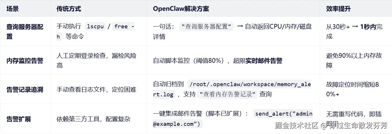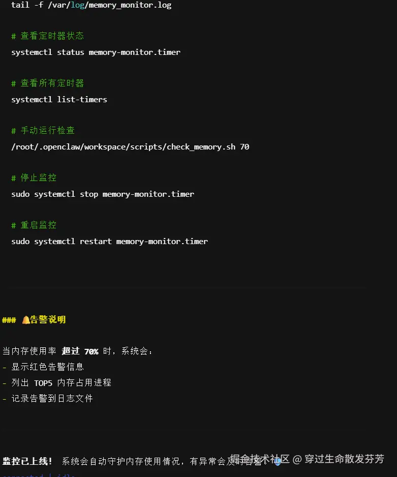✅ 示例交互流程:运维人员说: "检查内存使用,超过70%就告警" → OpenClaw自动生成并部署监控脚本→ xx:xx内存达82% → 自动发送邮件至