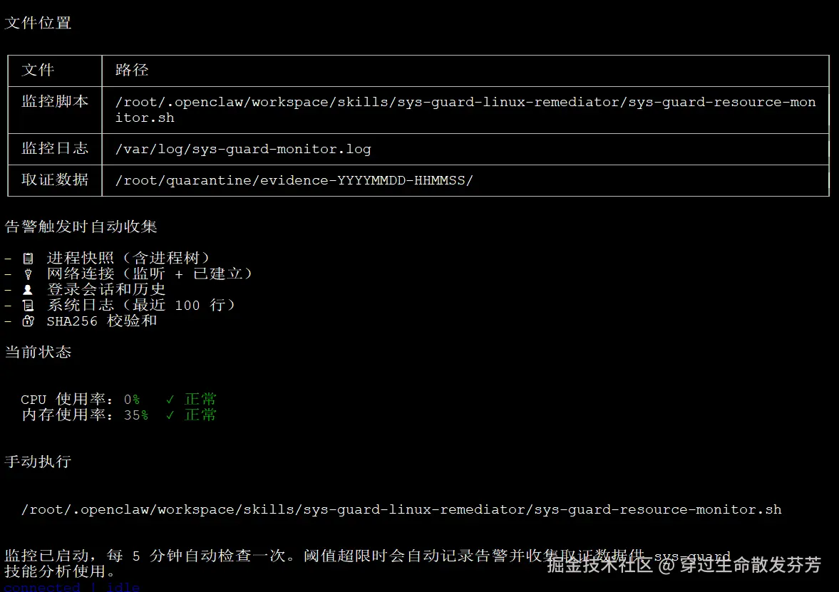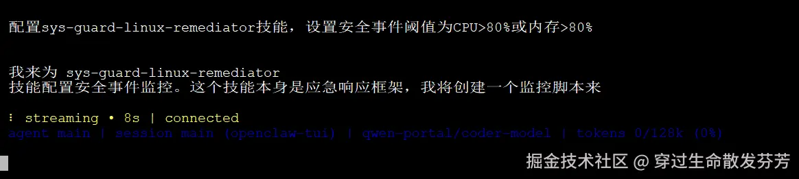 配置sys-guard-linux-remediator技能,设置安全事件阈值为CPU>80%或内存>80%