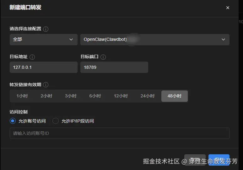 按照如下进行配置,其中访问控制可选,需要谁访问可以添加谁的账号或者IP。