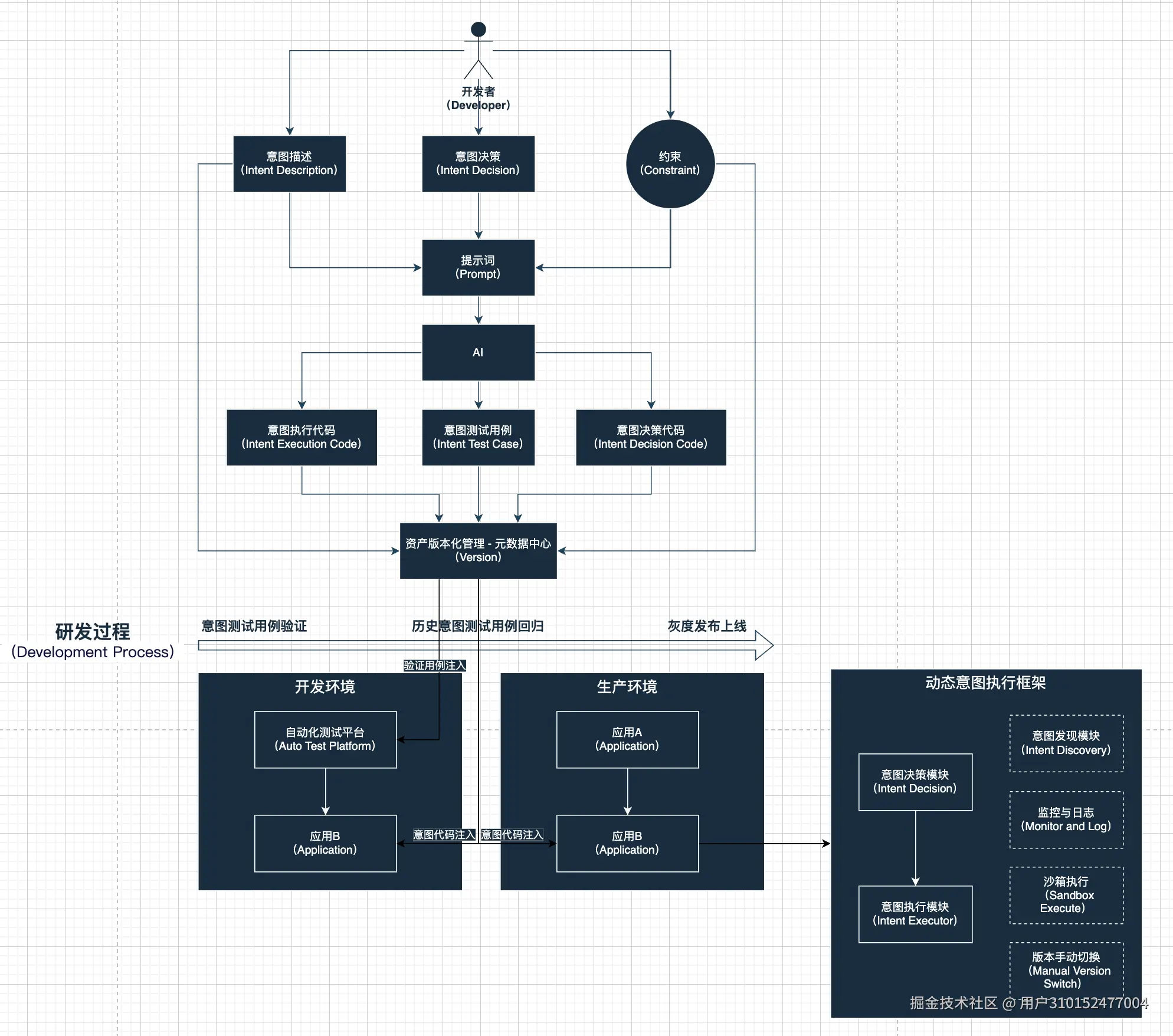 该架构需将意图描述拆分为意图描述文件与意图版本决策文件,通过决策逻辑实现版本灰度切换。