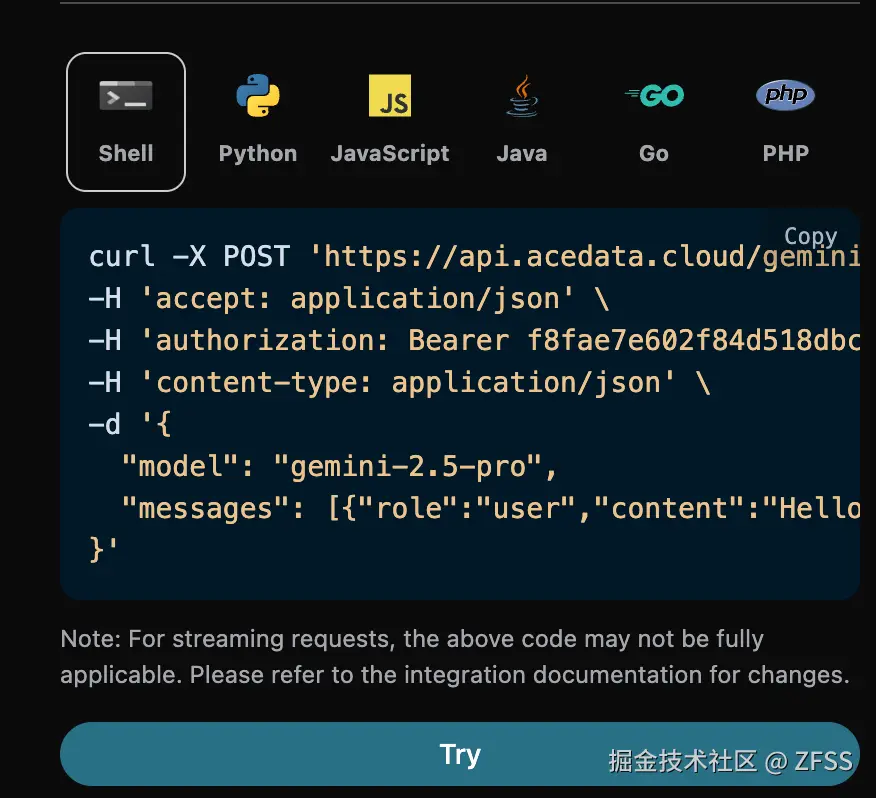 同时您可以注意到右侧有对应的调用代码生成,您可以复制代码直接运行,也可以直接点击「Try」按钮进行测试。
