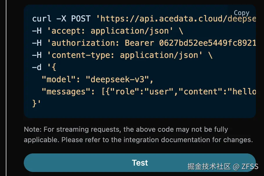 要使用 DeepSeek Chat Completion API,首先可以到 DeepSeek Chat Completion API 页面点击「Acquire」按钮,获取请求所需要的凭证: