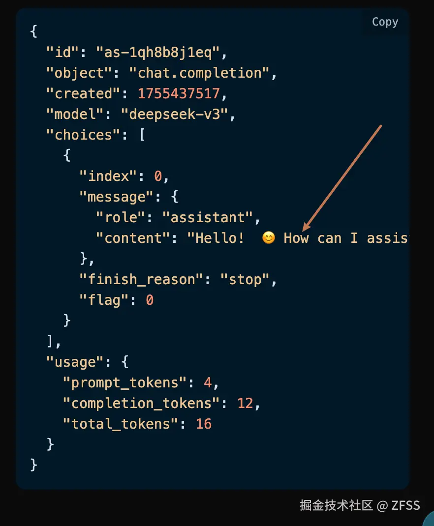 其中 choices 是包含了 DeepSeek 的回答信息,它里面的 choices 是 DeepSeek的回答信息,可以发现如图所示。