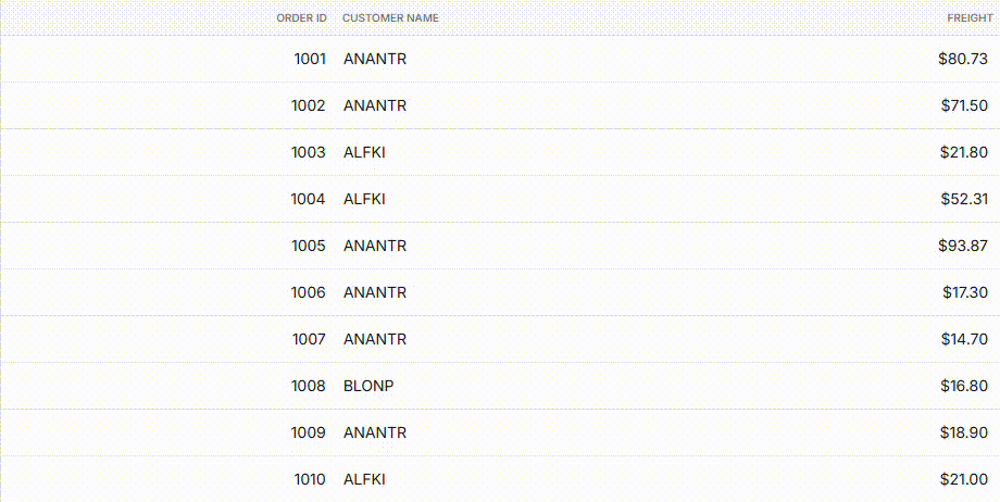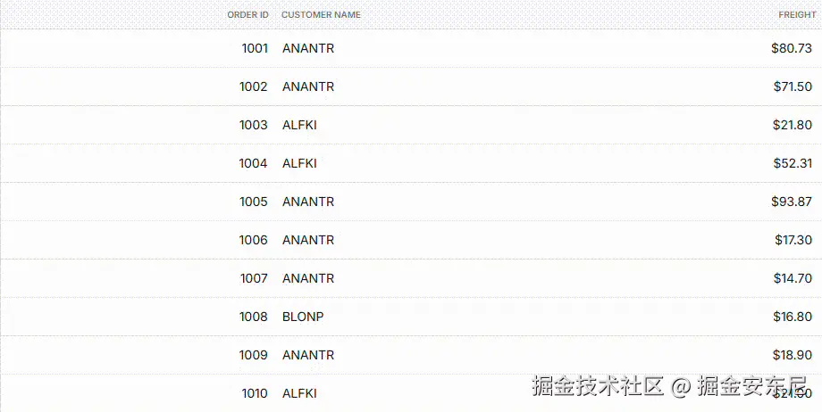 作者举了一个简单的订单列表:列包括 OrderID、CustomerID、Freight,并让 Freight 每 5 秒更新一次,模拟实时价格变化。