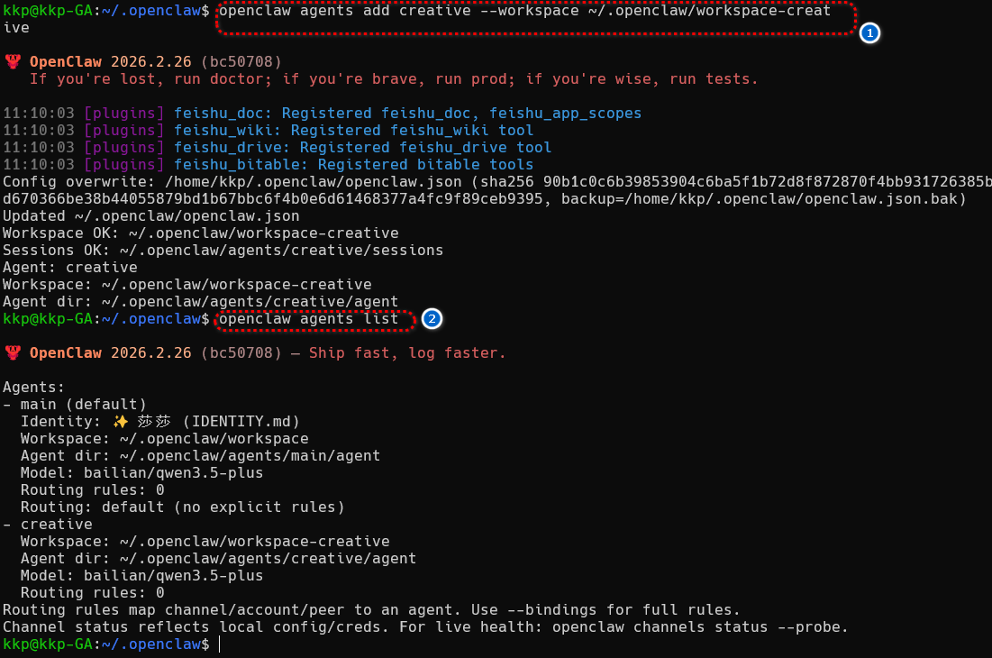 openclaw agents add creative --workspace ~/.openclaw/workspace-creative
