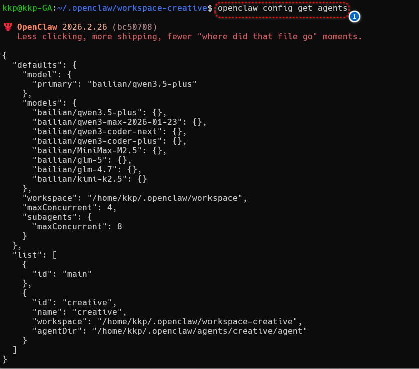 openclaw config get agents #验证配置