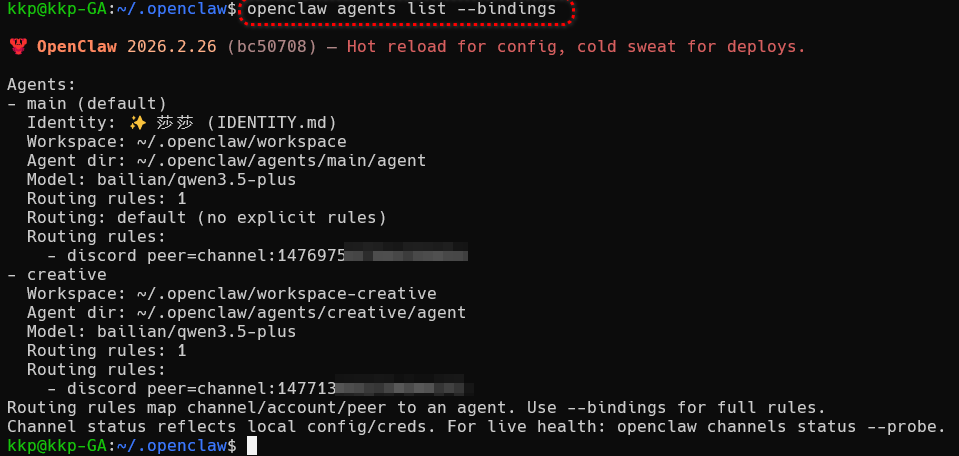 openclaw agents list --bindings #测试链接