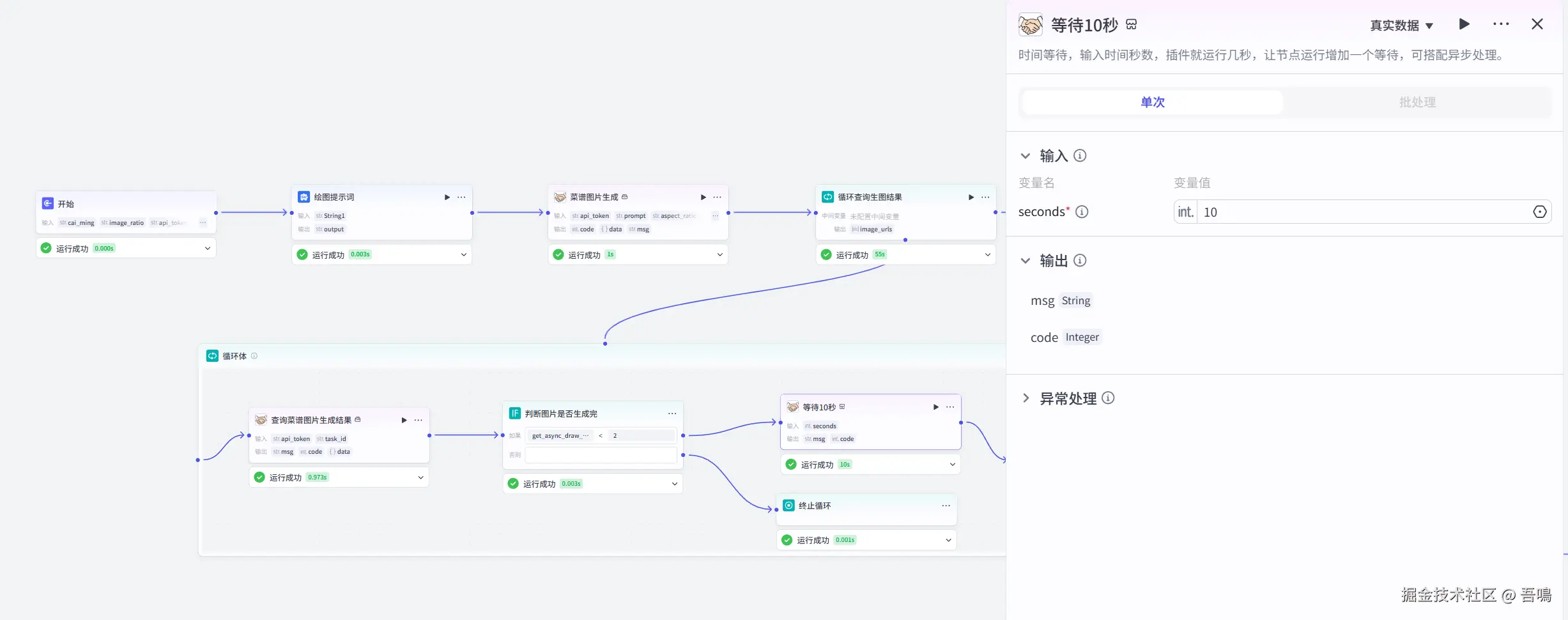在生图结果没有出来前先等待10S再查询,使用到了扣子三方插件【数字工具合集】的【time_wait_seconds】工具。