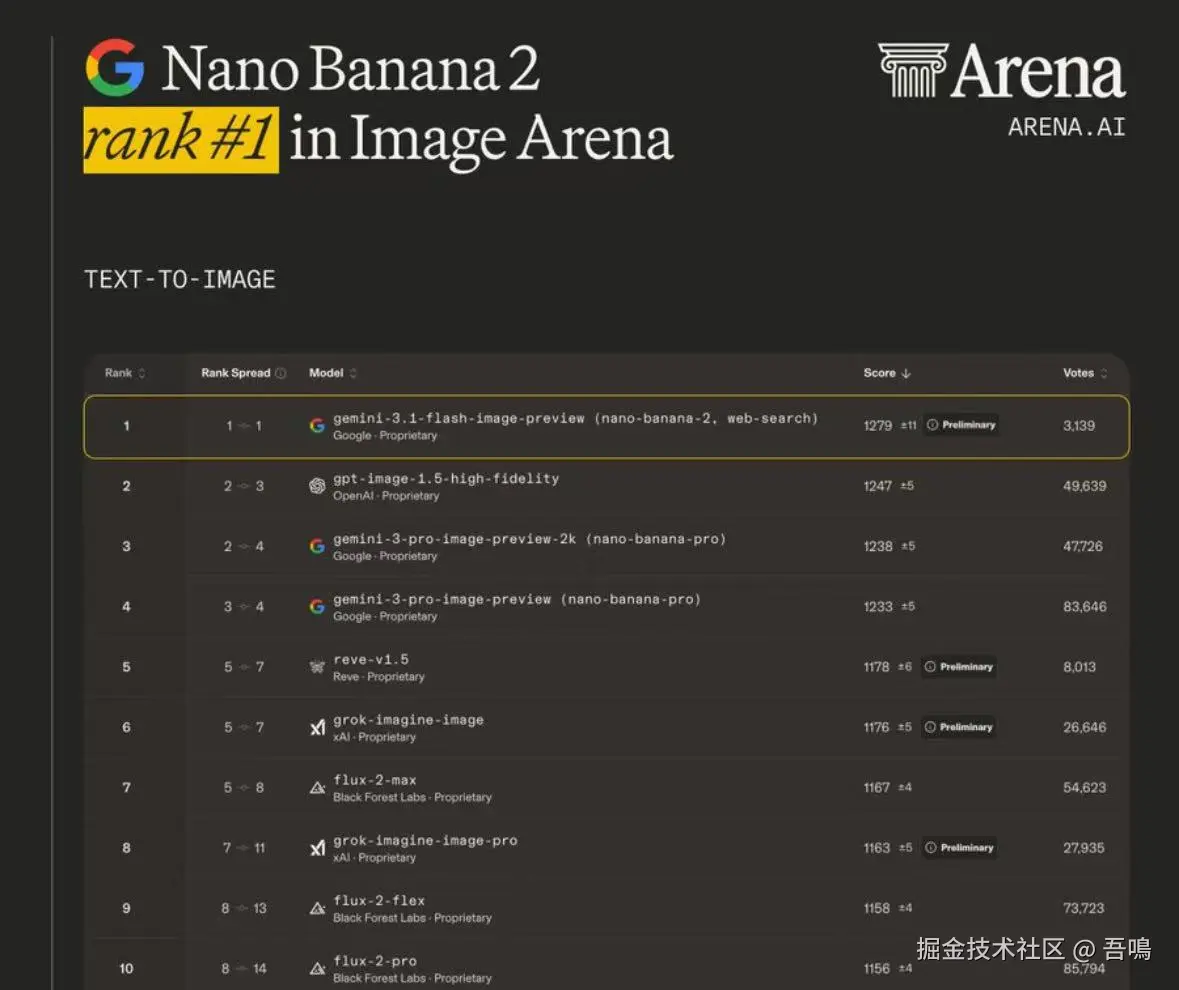 Google 最新推出了Nano Banana 2,在Arena(真实用户评测)中的评分直接打败了Nano Banana Pro,登顶榜首。
