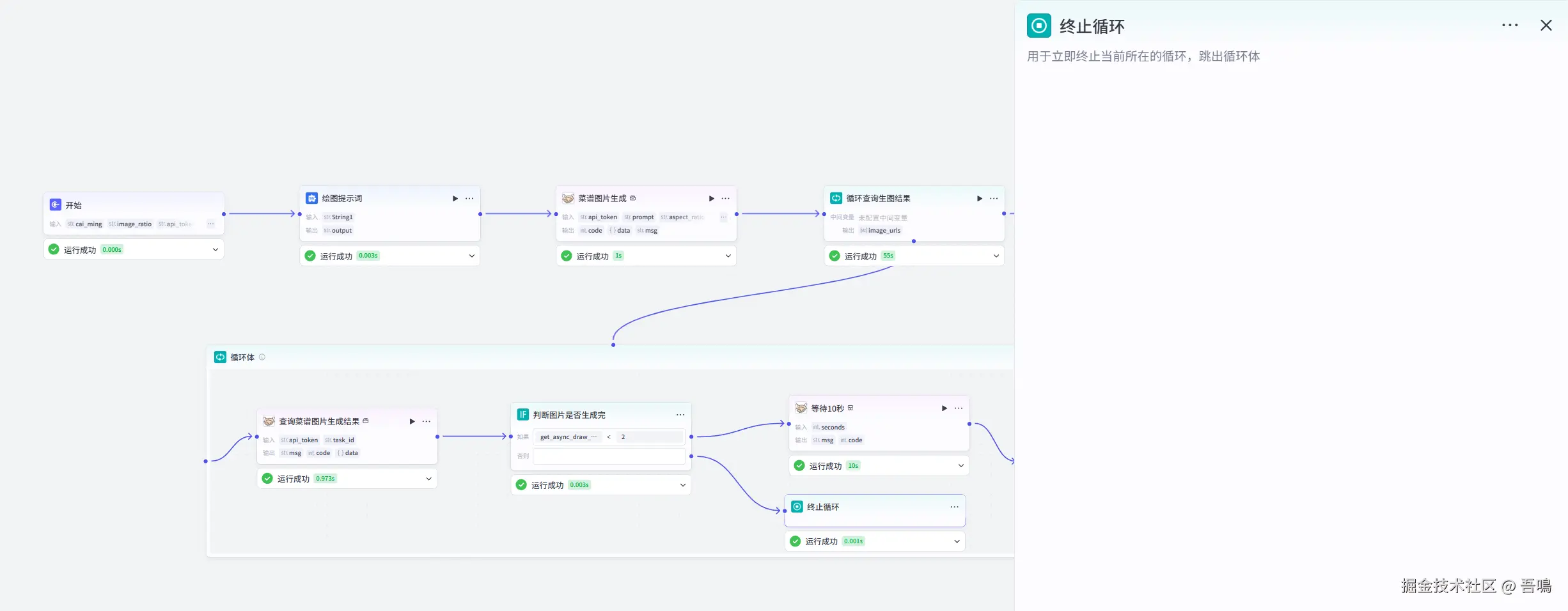 这个节点的作用是在图片结果生成好之后,终止查询生图结果,使用到了扣子官方的【终止循环】节点,需要注意,这个节点只有在循环体中才能使用。