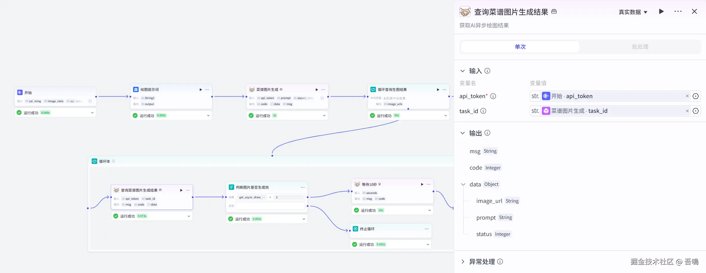 因为生图是一个比较耗时的过程,因此这里需要不断的去查询图片是否生成完成,使用到了扣子三方插件【AI绘图工具箱】的【get_async_draw_image_result】工具。