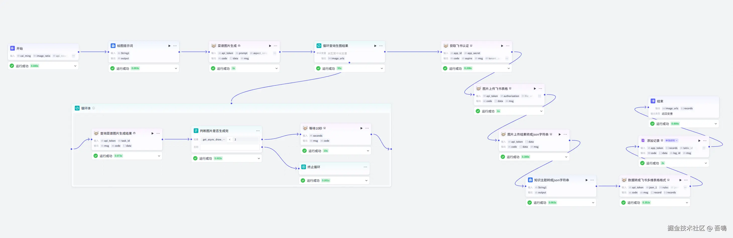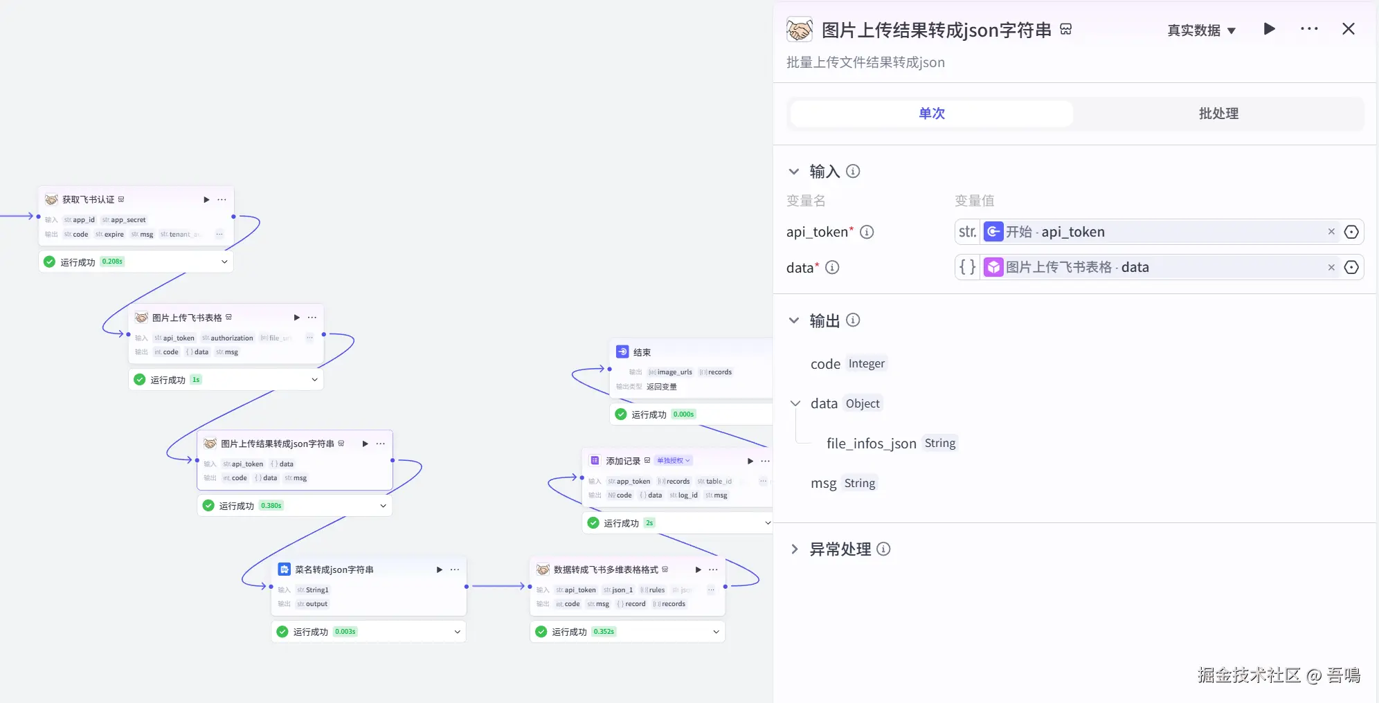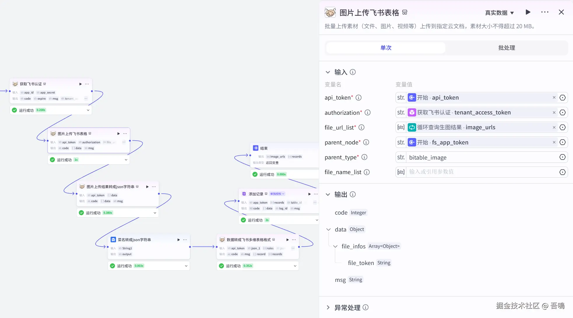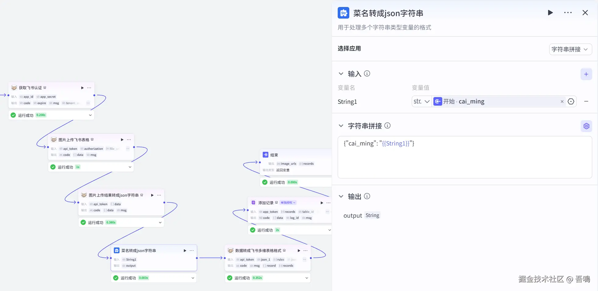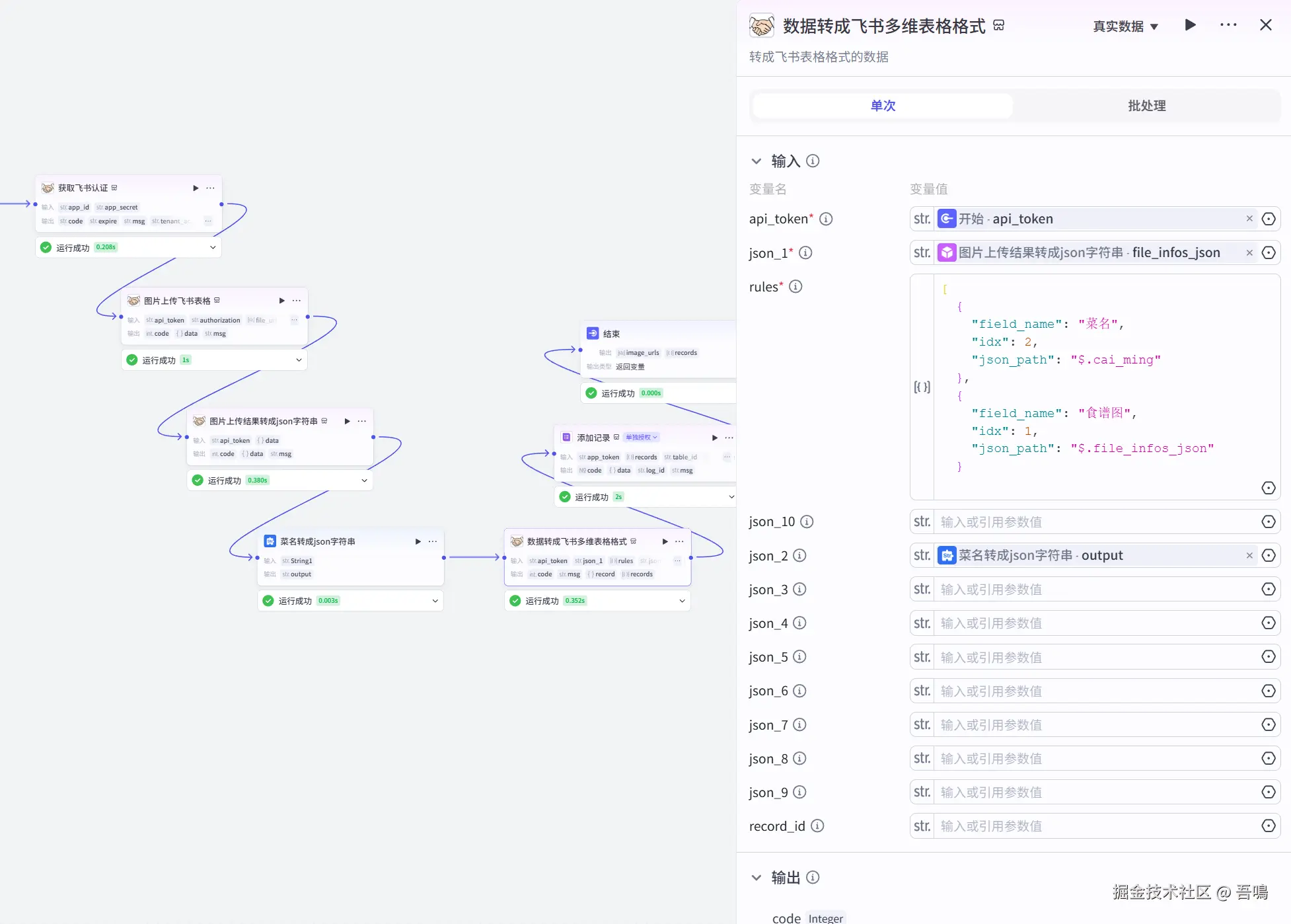 这个节点用于把图片、菜名信息添加到飞书多维表格的记录中,使用到了扣子官方的插件【飞书多维表格】的【add_records】工具。