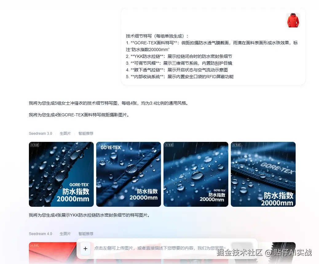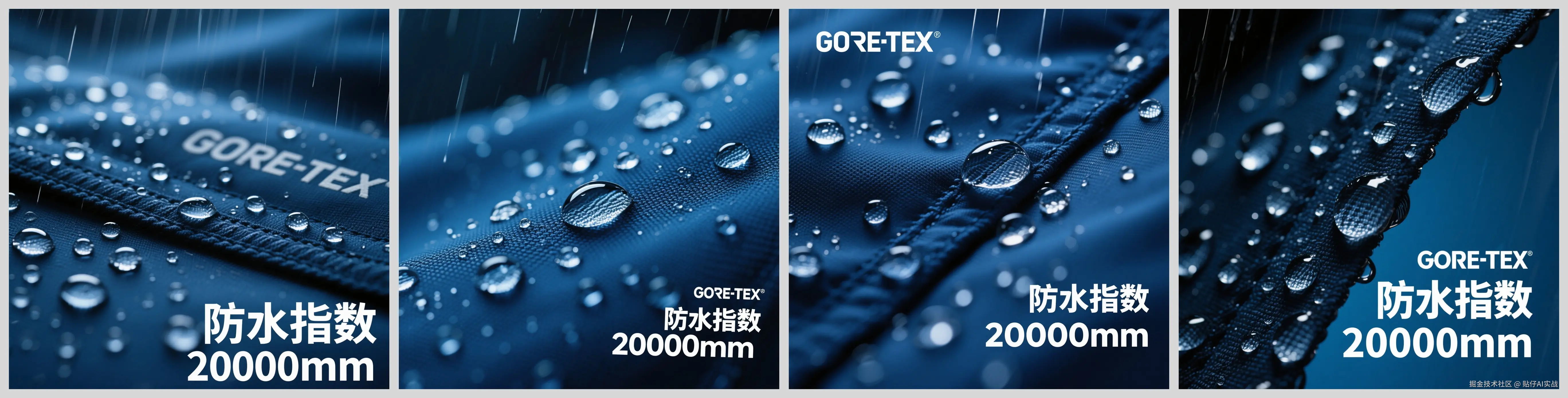 - GORE-TEX**面料特写:微距拍摄防水透气膜截面,雨滴在面料表面形成水珠效果,标注“防水指数20000mm”