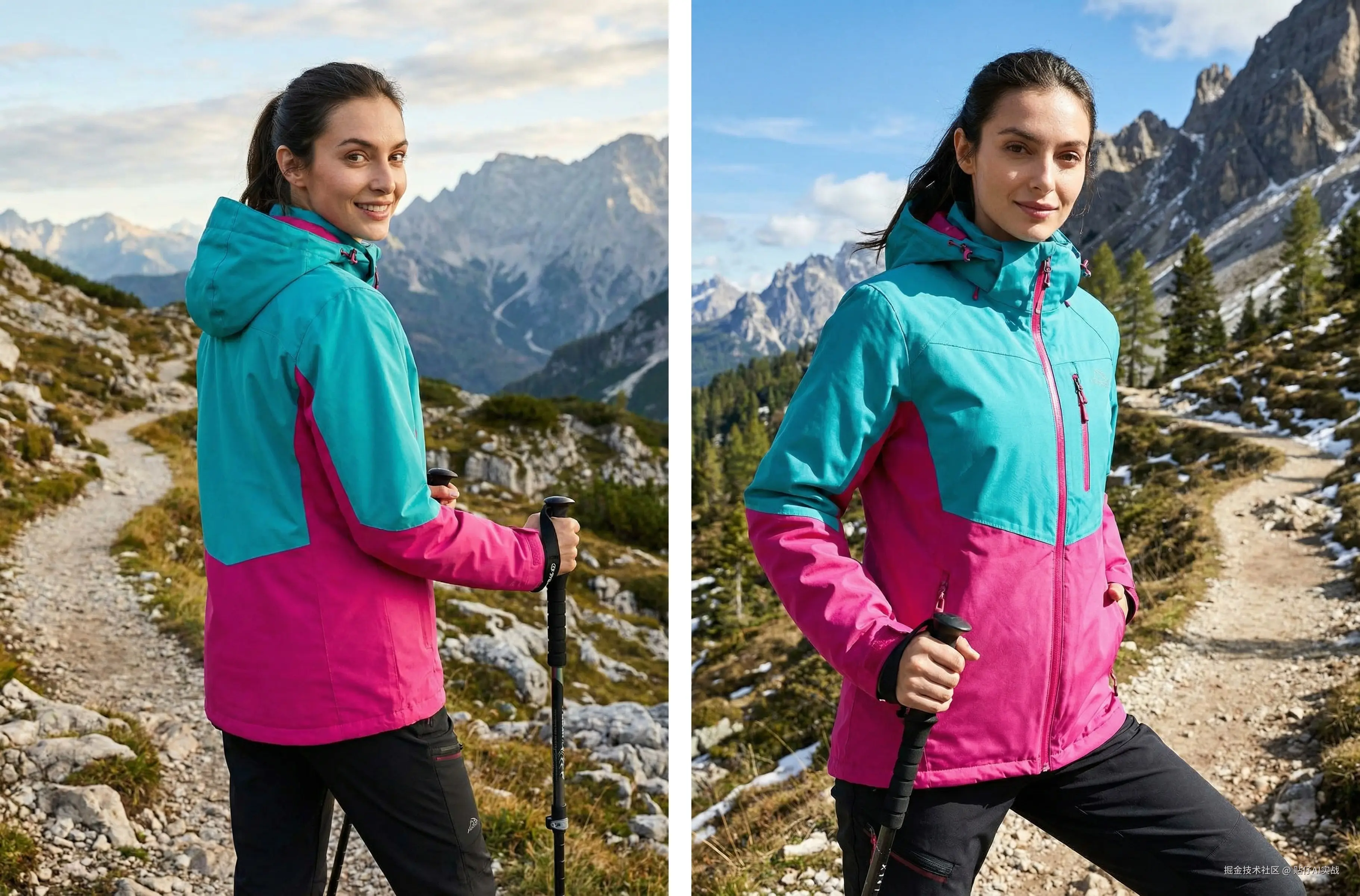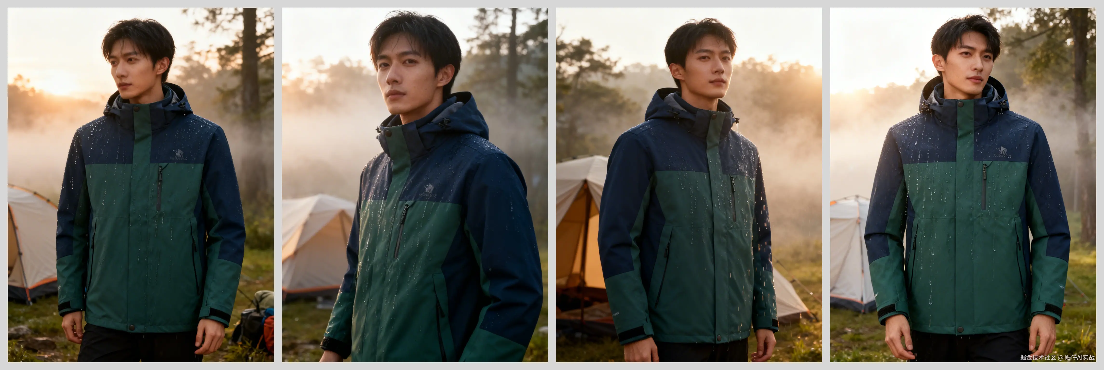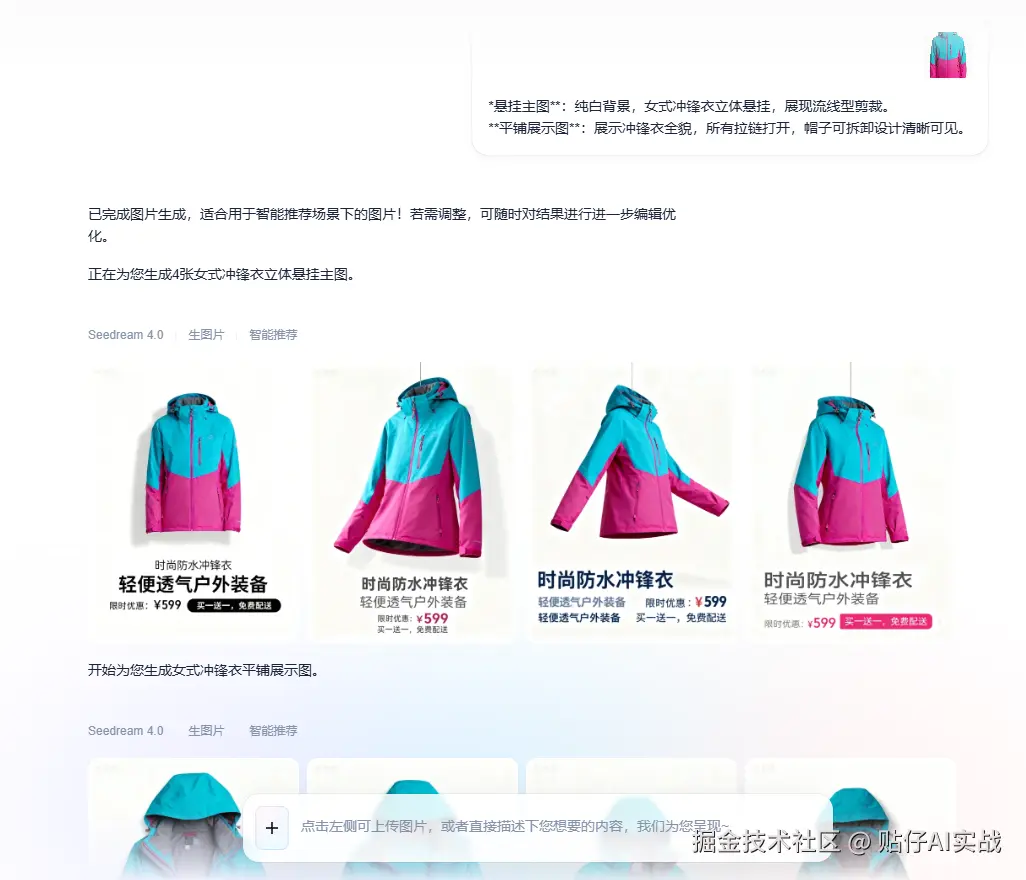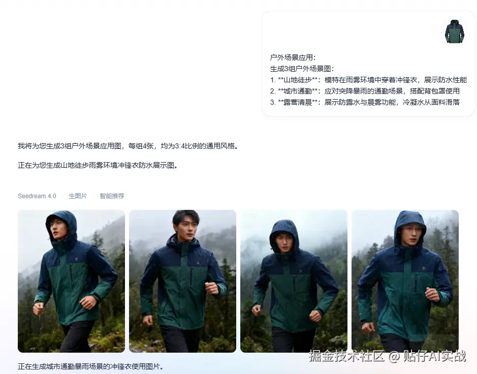 我上传的是一张亚马逊户外服饰图,大家可以看到,生成效果完全在线:AI能智能识别服饰品类,匹配的户外背景与户外服饰高度契合,不会出现模型判断失误(比如把户外冲锋衣放到粉色小清新场景这种违和感),细节拉满!